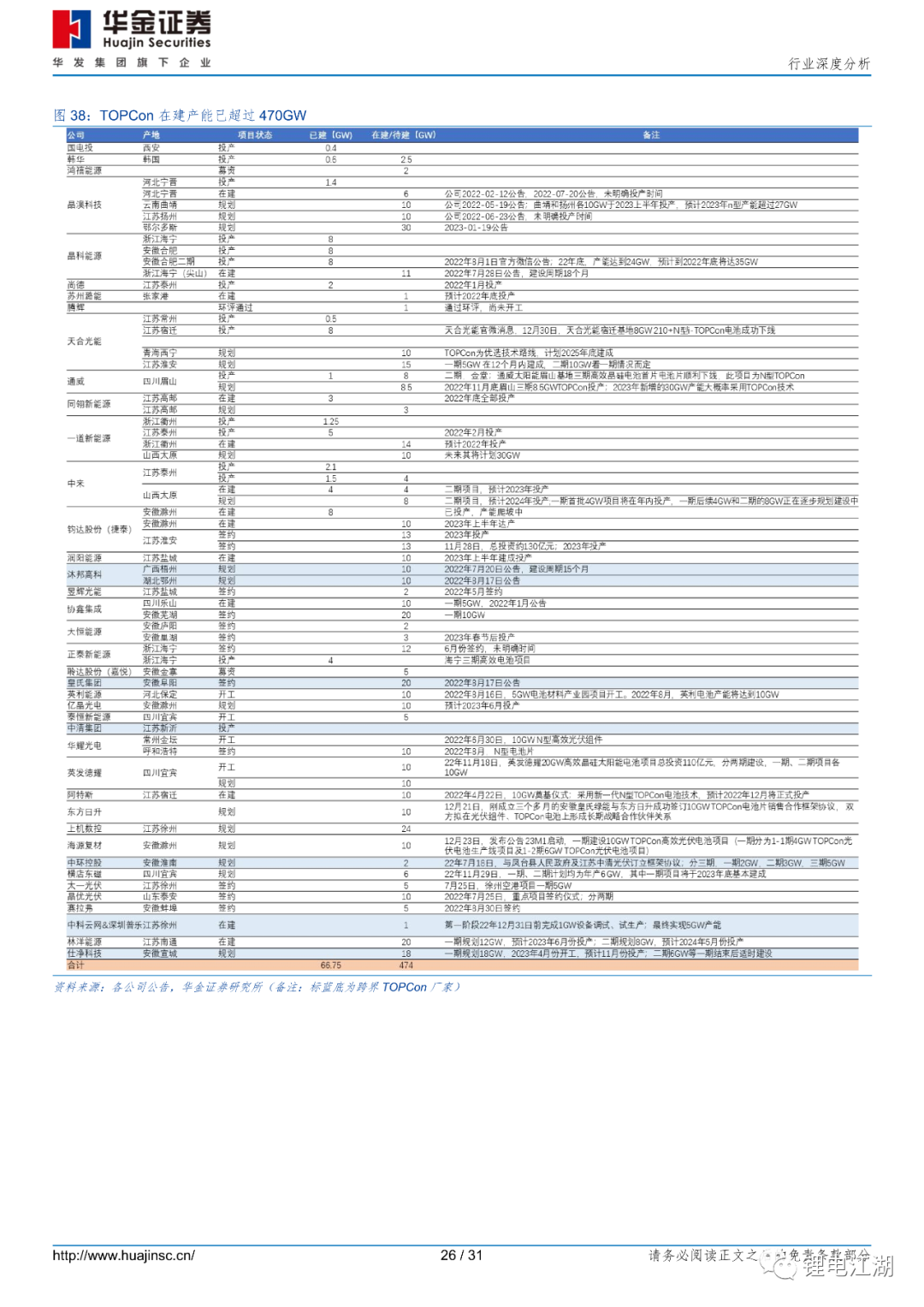 行业转型,TOPCon电池率先实现大规模量产:随着PERC电池量产效率逐渐接近其理论效率,行业开始转向TOPCon/HJT等N型电池。而TOPCon电池以其电池效率高、设备投资成本低、与PERC产线兼容性高等优点,率先实现大规模量产。据不完全统计,截止目前,TOPCon已投产69.75GW,规划待建产能近474GW。