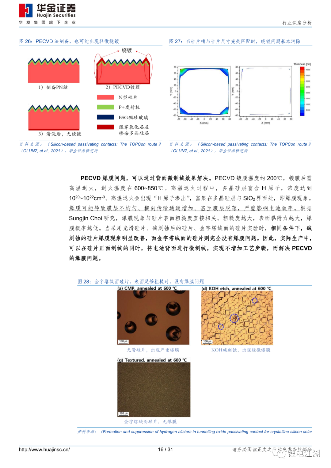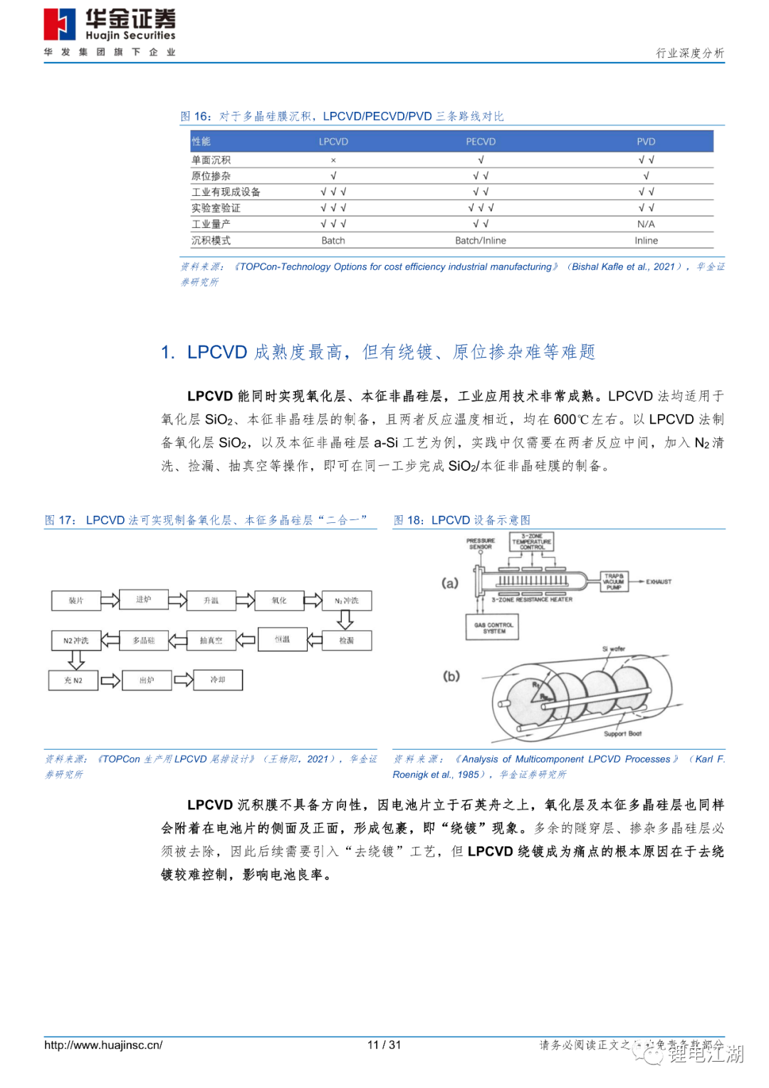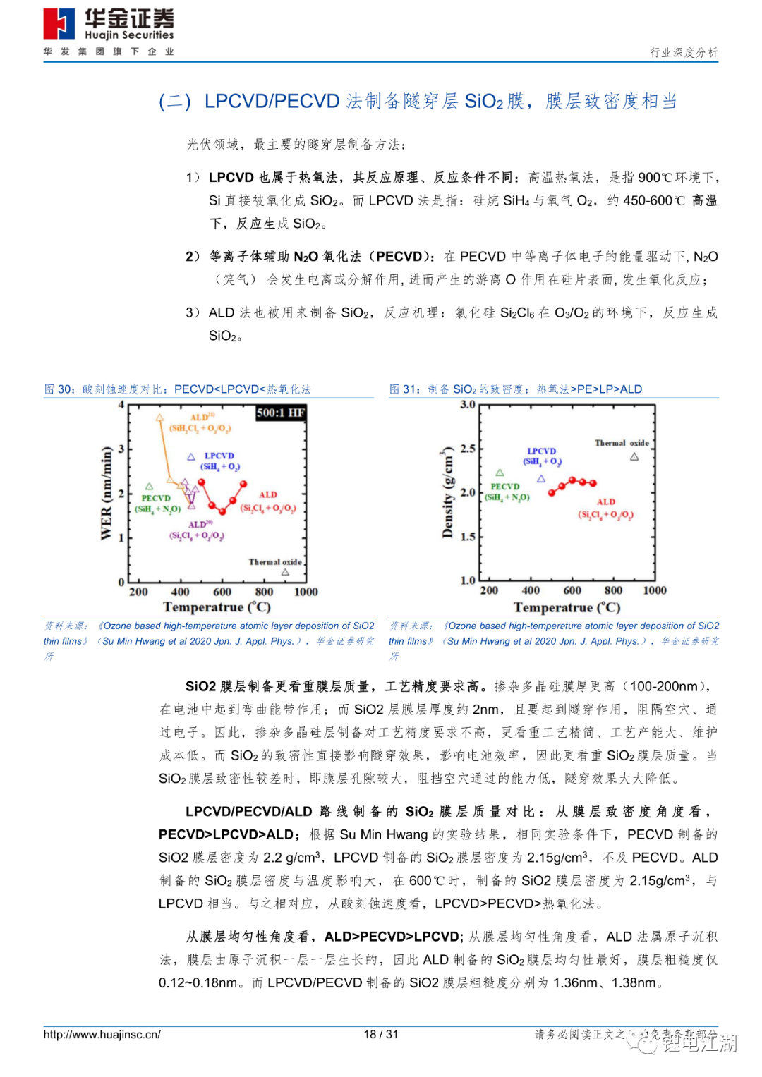 从技术角度看,PECVD法能实现LPCVD法同等制备效果,且清洗绕镀简单,工艺精简、良率预期更高。LPCVD路线技术最成熟,但有严重绕镀、原位掺杂难等问题。因绕镀,LPCVD设备需增加一倍设备;PVD路线,根据ISFH研究观点,PVD钝化效果略差。且实际运行中,维护频率高,开机率低;而PECVD路线轻微绕镀、且清洗容易,可原位掺杂、工艺精简,爆膜问题可通过电池背面微制绒解决。隧穿氧化层质量对电池效率影响至关重要。文献数据显示:从膜层密度角度看,PECVD制备的氧化层密度(2.2g/cm3)要优于LPCVD(2.15g/cm3);从膜层均匀性角度看,PECVD法制备的氧化层粗糙度1.38nm,与LPCVD制备的氧化层粗糙度1.36nm相当。