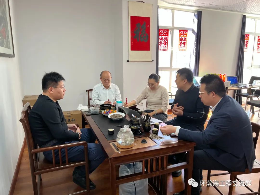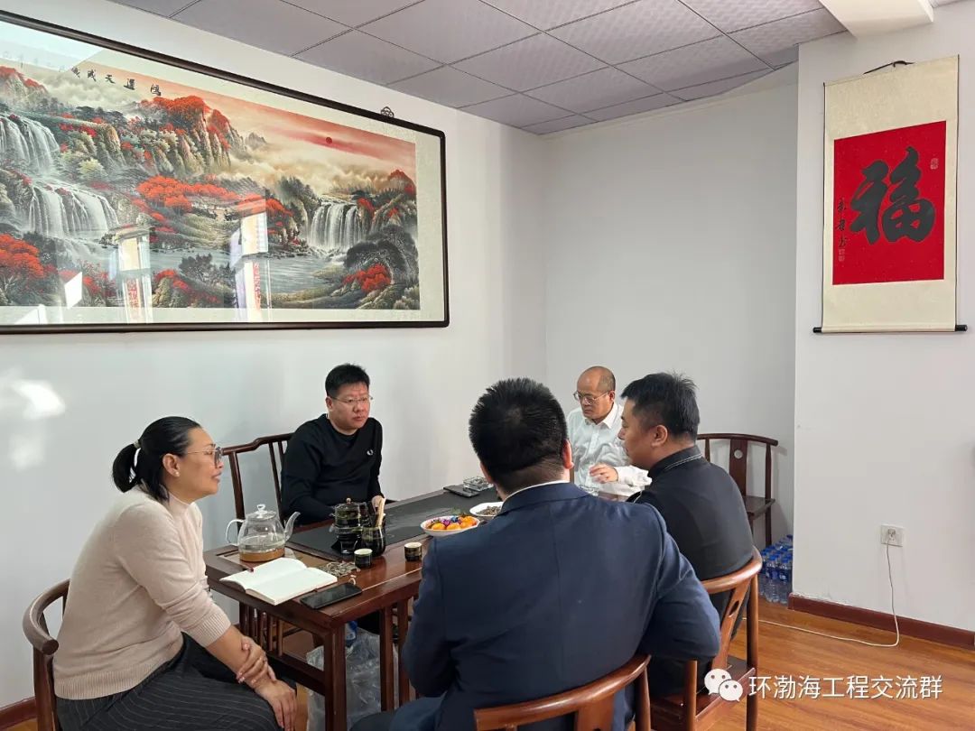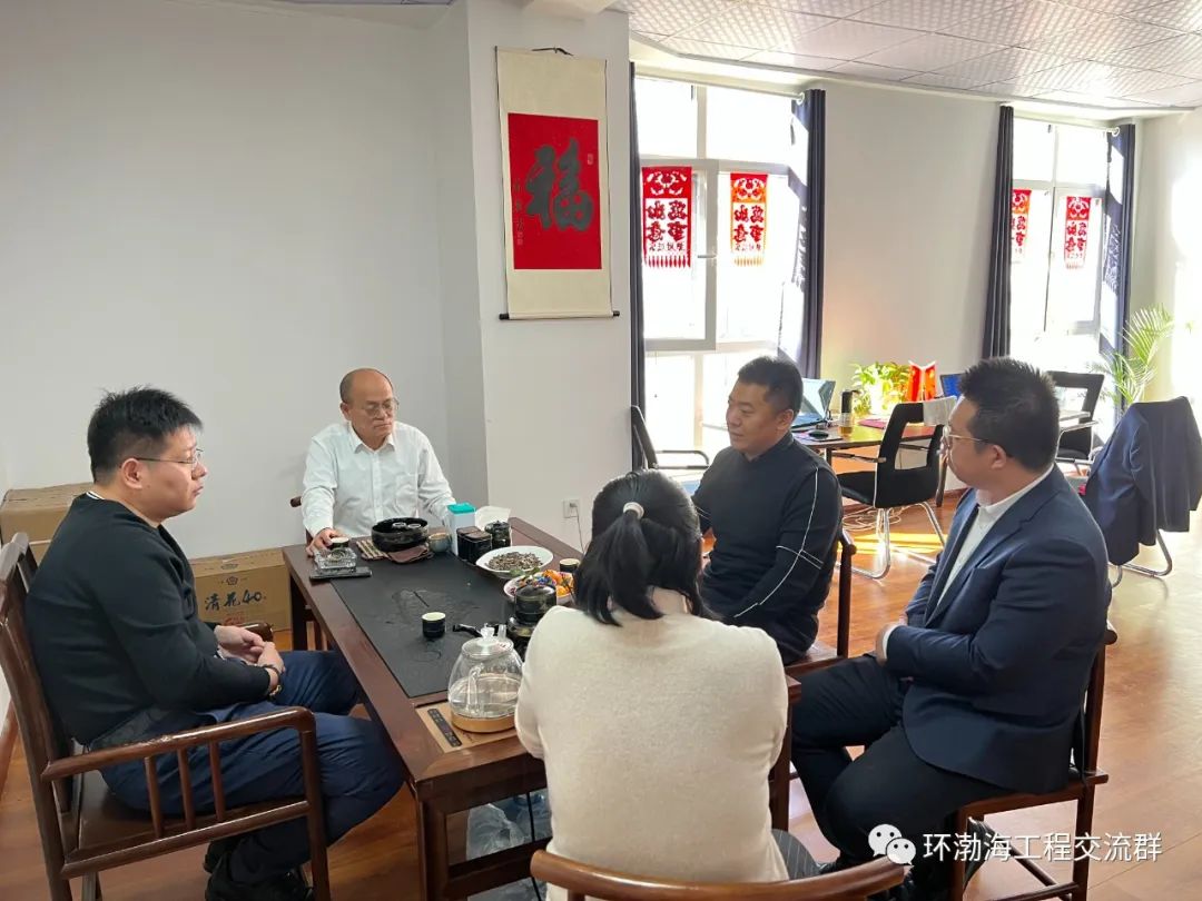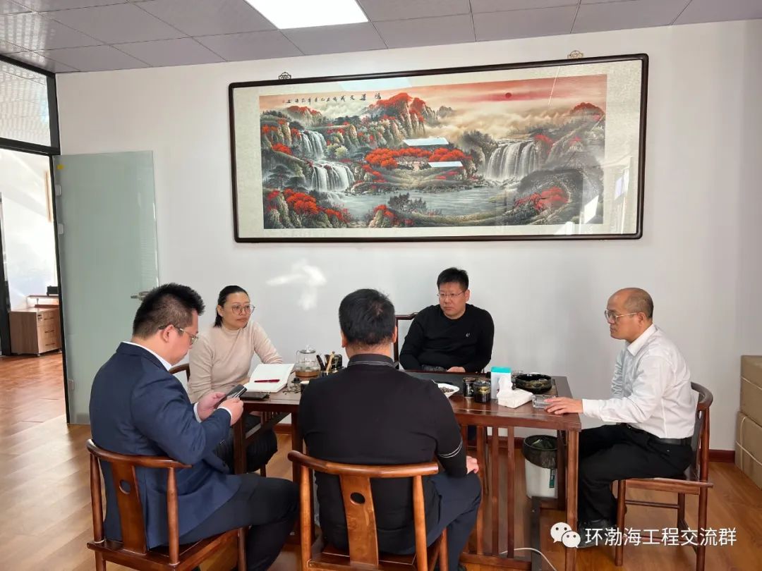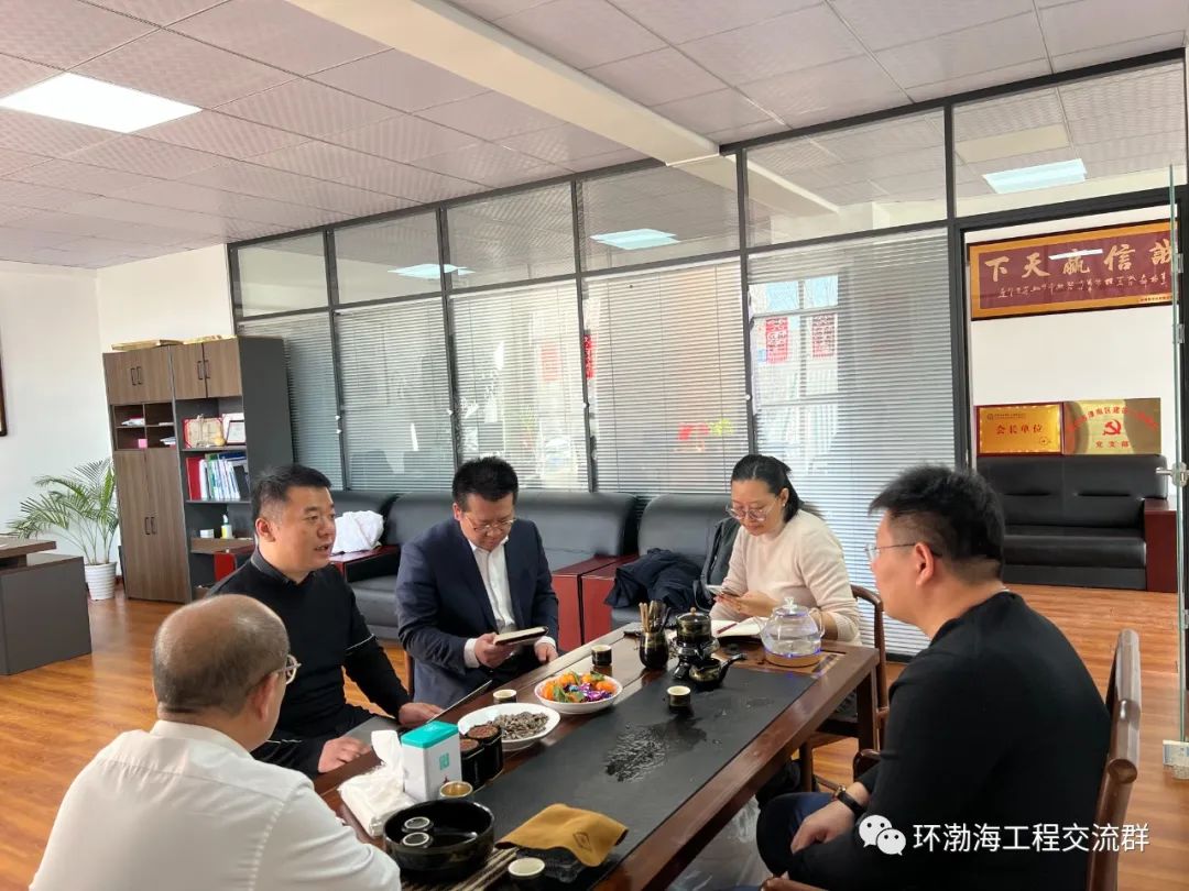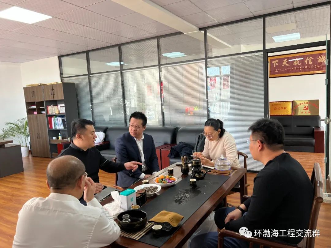 会长邢轶武,党支部书记张冬,秘书长葛维娜,副会长张鑫和会员和银针总经理进行交流
