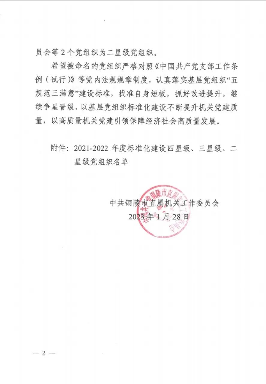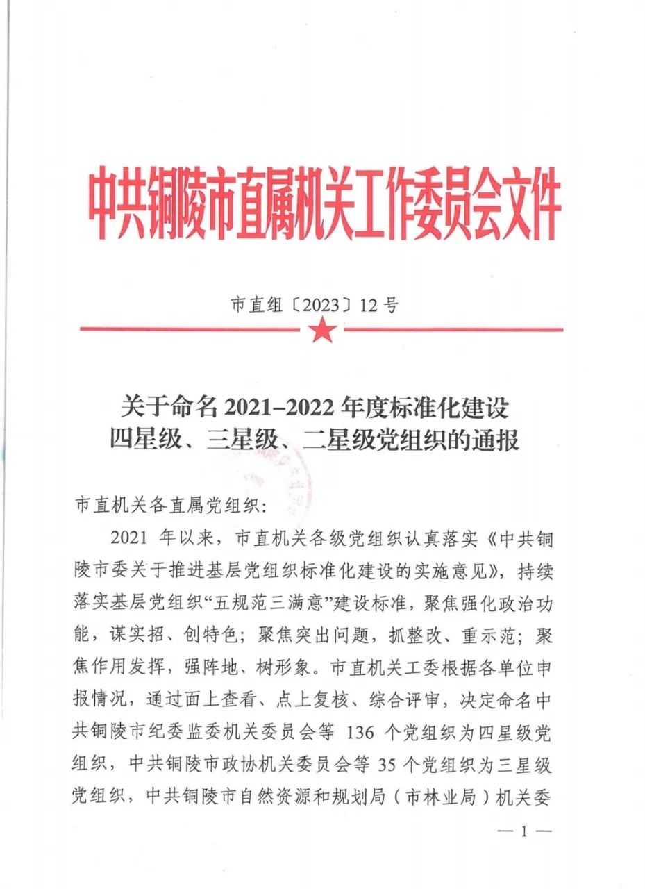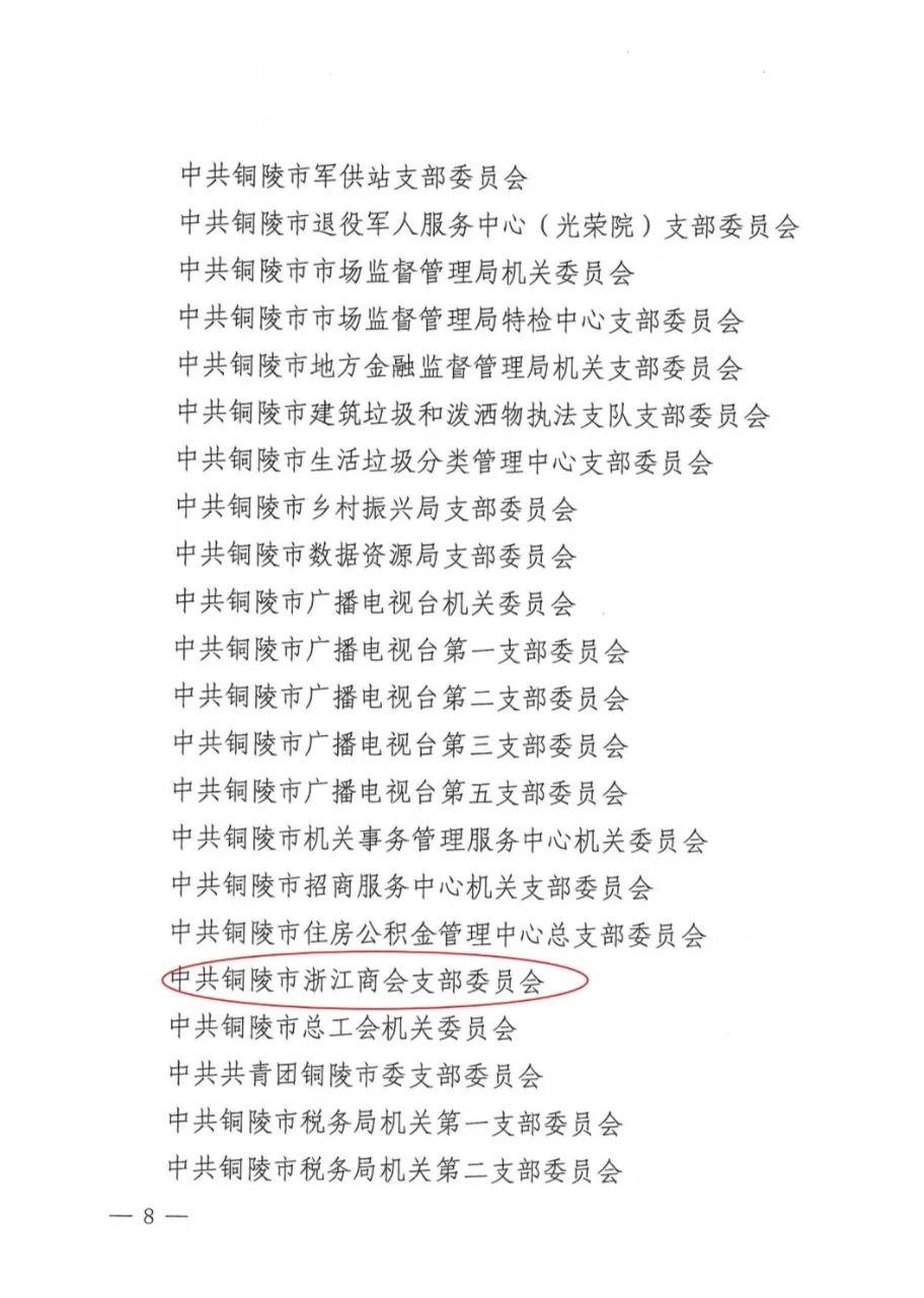 日前,中共铜陵市直机关工作委员会发文,命名铜陵市浙江商会党支部为“2021-2022年度标准化建设四星级党组织”。