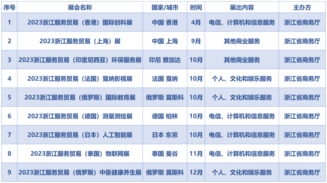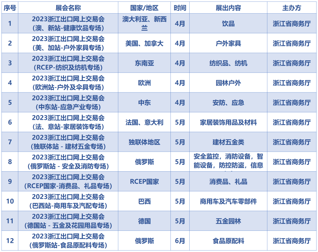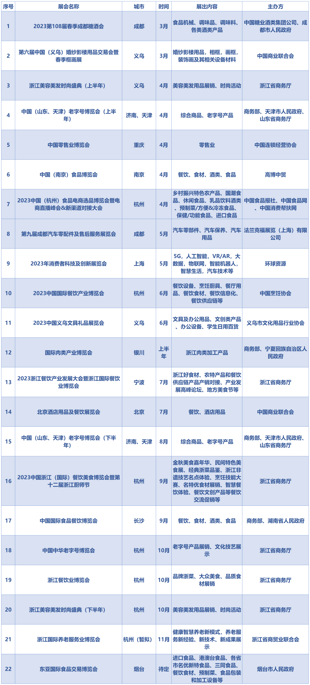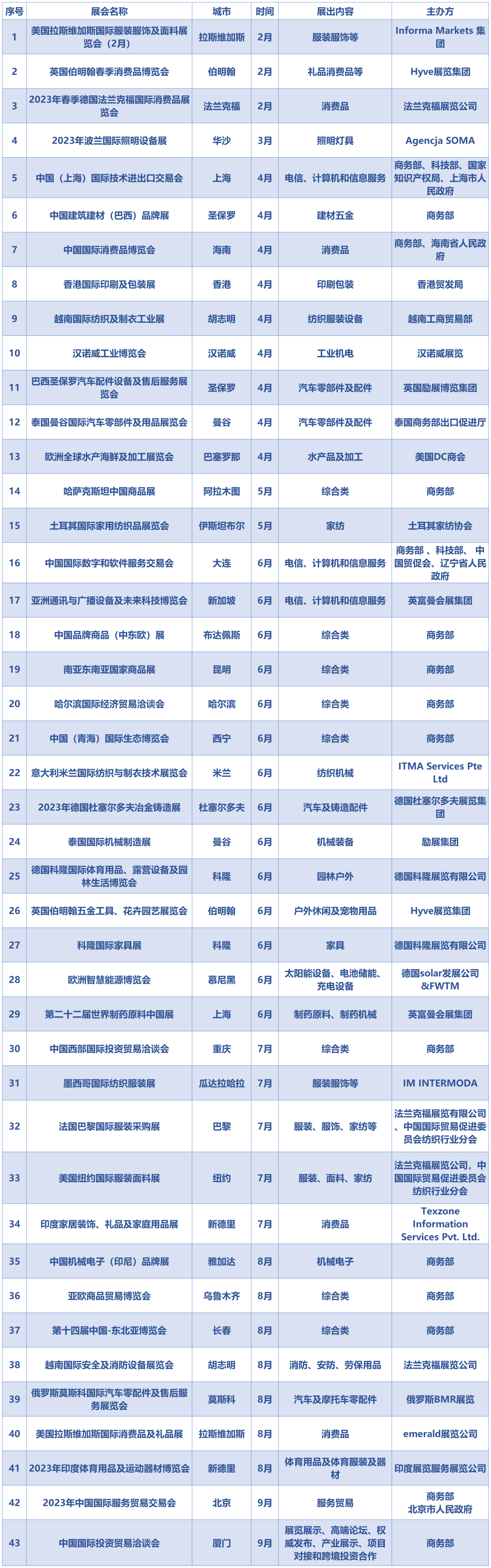 近日,浙江省商务厅会同各市及相关单位研究确定了2023年度商务展会目录。2023拟举办和支持展会252个,进一步发挥好疫情下展会开拓国际国内市场、稳定开放型经济的积极作用。