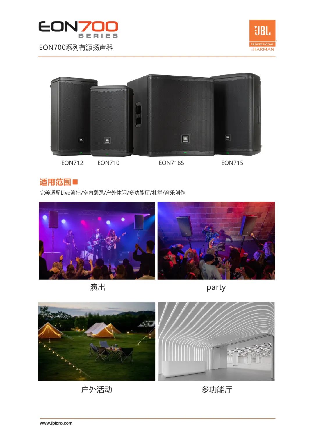 EON 700系列,包括10”的EON710,12”的EON712,15”的EON715蓝牙有源多用途扬声器和18”的EON718S超低音扬声器。得益于JBL升级定制的驱动器单元和号筒,带来高品质的声音和令人震撼的覆盖,由于响亮、清晰的声音,加上高达1300W(全频扬声器)或1500W(超低音扬声器)通透、高效的功率,使得该系统是各种中等规模的室内或室外活动的理想选择。