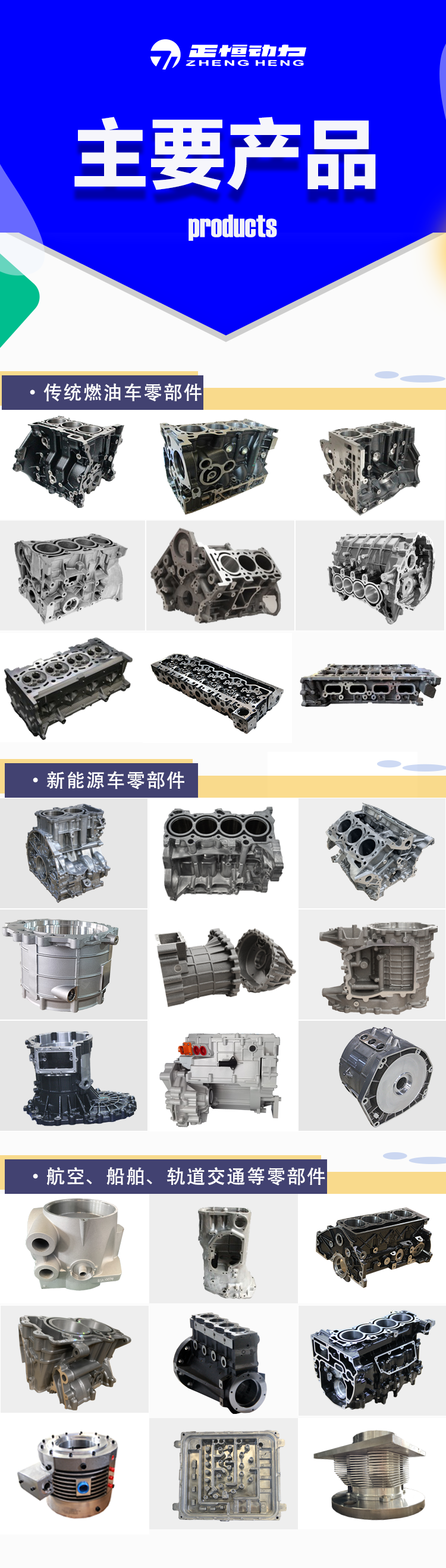 历经多年的发展,正恒动力已成为国内知名的发动机缸体、缸盖、轴承盖、油泵体、变速箱壳体、铸铝零部件生产基地。产品覆盖汽车、工程机械、船舶、轨道交通等领域。
