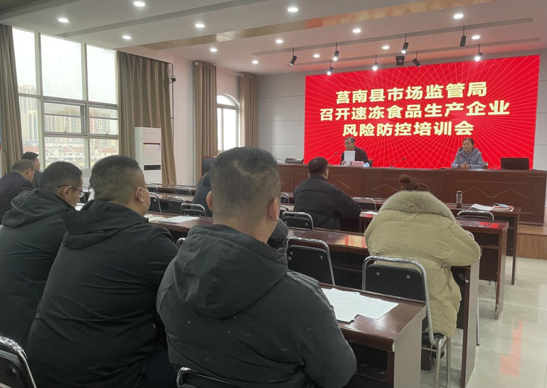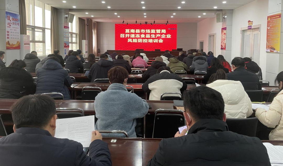 为推动速冻食品生产企业落实主体责任,提升食品安全管理水平,保障全县人民群众饮食安全,2月8日,莒南县市场监管局在县局五楼会议室组织召开了速冻食品生产企业风险防控培训会议。莒南县市场监管局党组成员、副局长赵景超参加会议并讲话,食品生产科全体人员、各市场监管所监管人员,辖区内速冻食品生产企业负责人,共70余人参加会议。