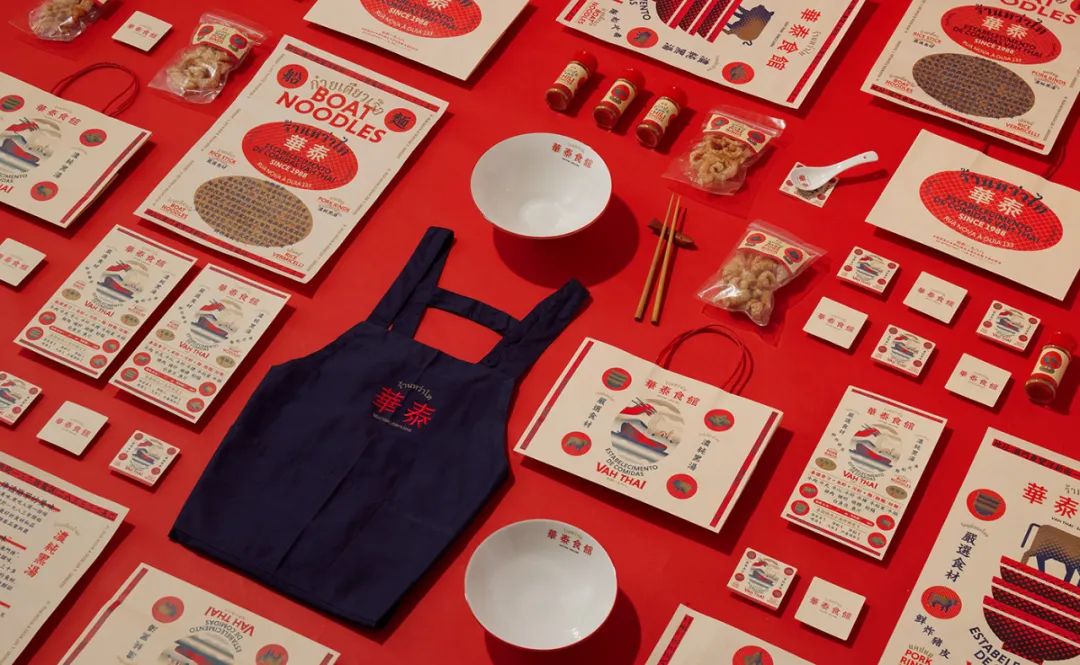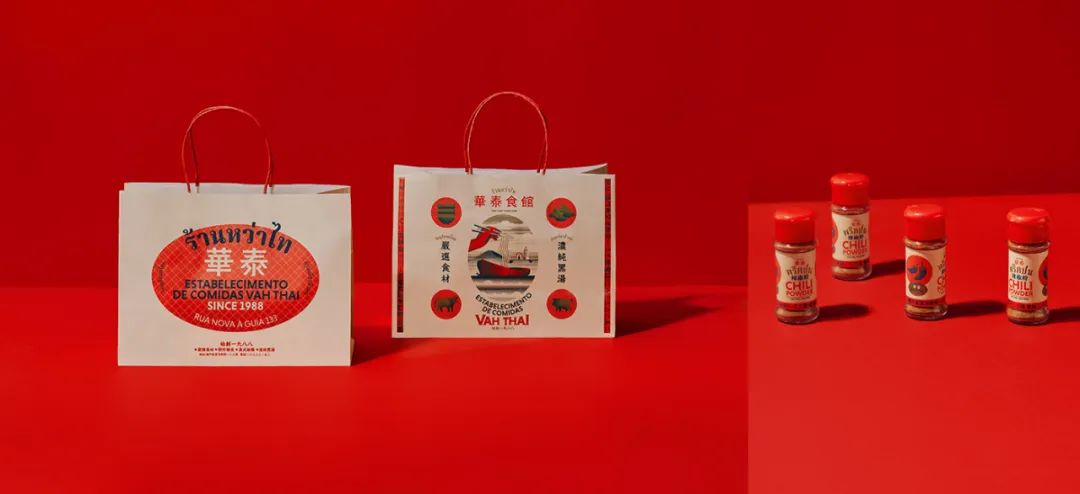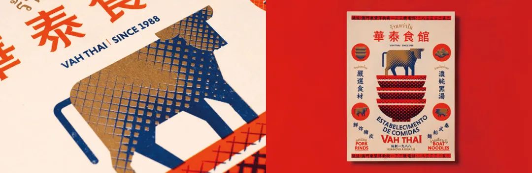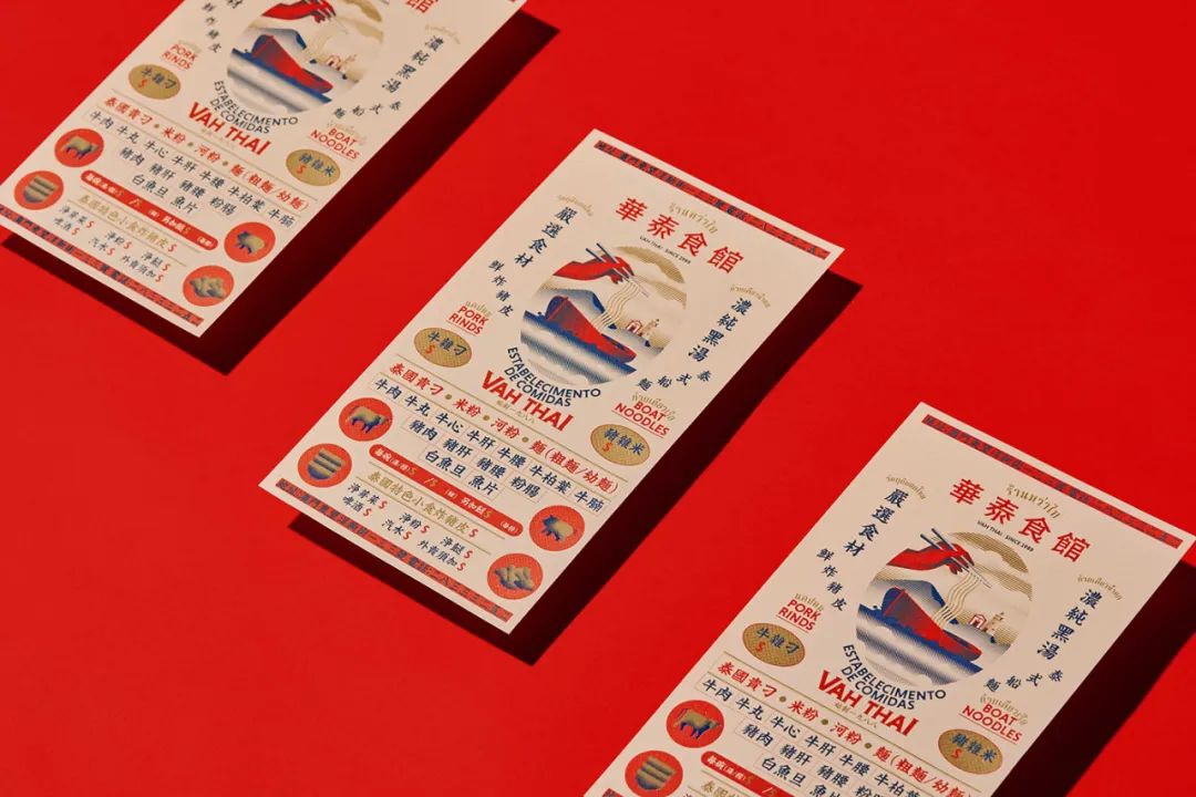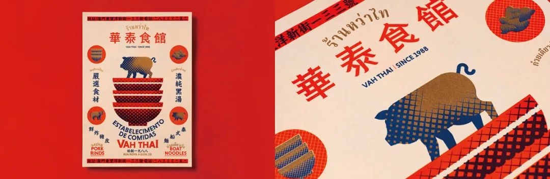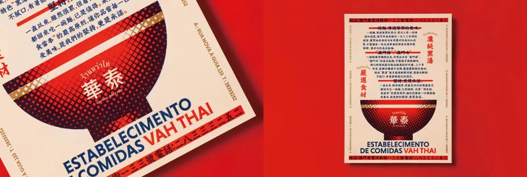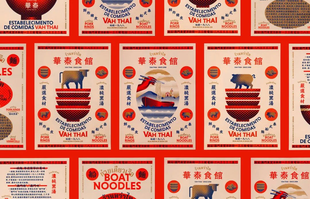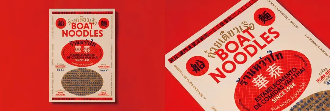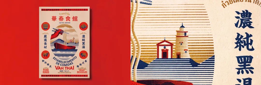 这些插图是围绕餐厅经典的新鲜食材和招牌船面创作的,以及记录餐厅创始人一些故事的排版。在字体方面,品牌字体设计特别结合了中泰文化融合的特点。此外,我们对80年代澳门和泰国餐厅常用的字体做了很多研究,并选择了相似的字体。