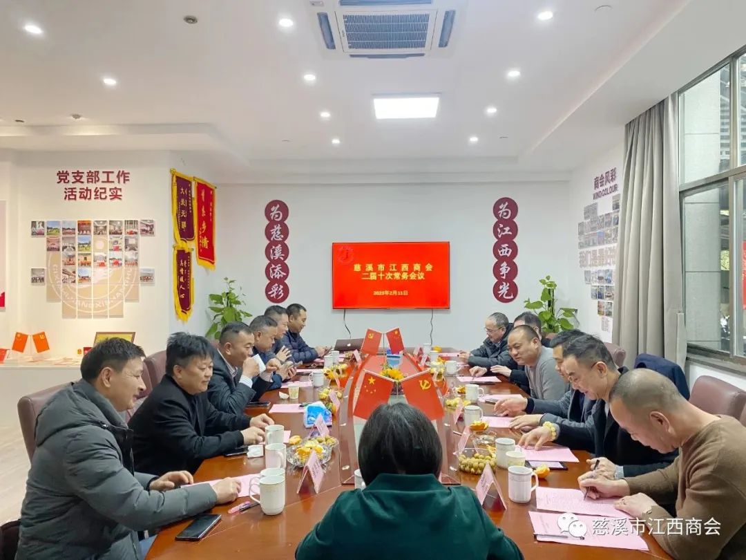 2023年2月11日下午,“慈溪市江西商会二届十次常务会议”于商会办公室顺利召开。会长何水兵、执行会长沈佳茂、监事长刘军,常务副会长兼党支部书记李桥兵,秘书处帅青柏,常务副会长周玉清、谢陆意、鲍剑平、胡东、盛胜发、熊玉文、乐小勇、胡章华,常务副秘书长陈姝贞出席会议,本次会议由秘书长帅青柏主持。