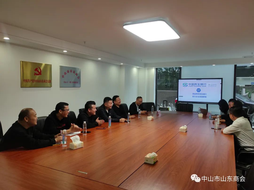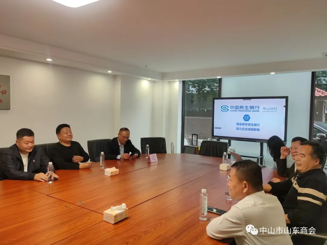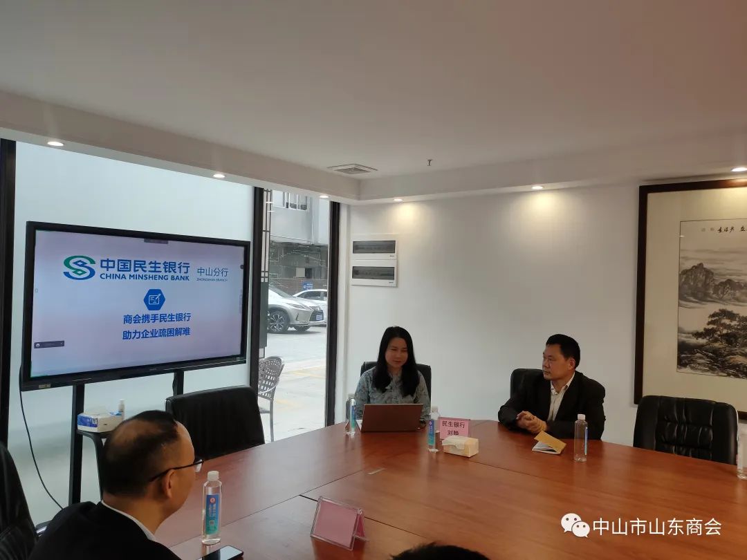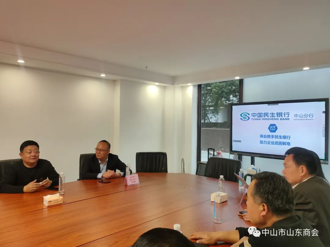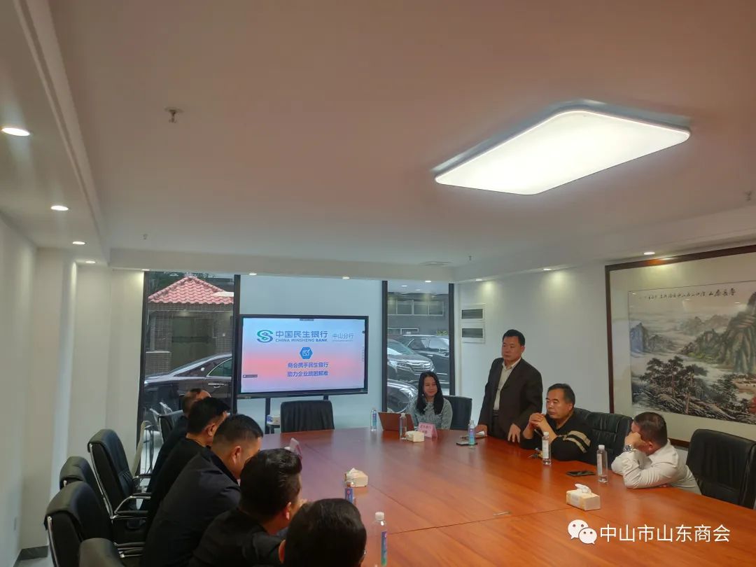 2023年2月11日下午,中山市山东商会特邀民生银行中山分行刘静作为主讲嘉宾、坐席嘉宾民生银行商协会中心林伟鑫先生莅临指导,为解决会员企业融资难、贷款难,拓宽会员企业融资渠道,构建商会金融服务体系多样化,现场介绍了民生银行小微贷方案,为有需求的会员降低融资压力。参加人员主要有中山市商会轮值会长张辉以及部分会员企业负责人,由秘书长门广成主持!