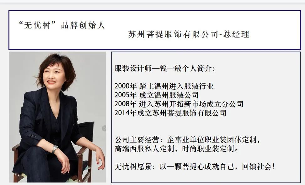 菩提服饰总经理钱一敏对刘先帅秘书长一行的到来表示了热烈的欢迎,并对公司情况做出介绍,她表示:苏州菩提服饰有限公司,是一家集设计、开发、生产、销售于一体的综合性现代化服饰有限公司,主要为企事业单位提供职业装定制、高端西装私人定制和时尚职业装定制。