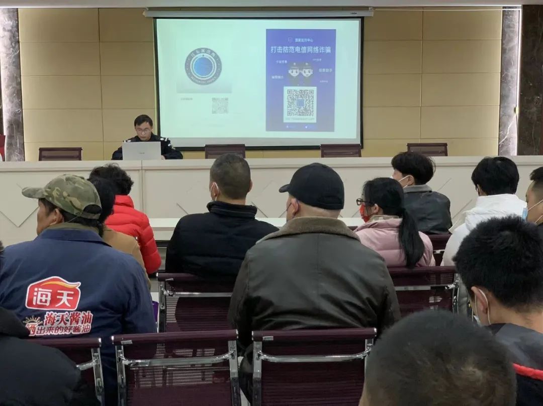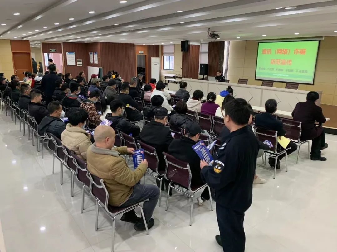 江东派出所民警向参会人员发放反诈宣传单并普及反诈知识,耐心地讲解电信网络诈骗的危害及常见诈骗手段,并用通俗易懂的方式传授防骗技巧。