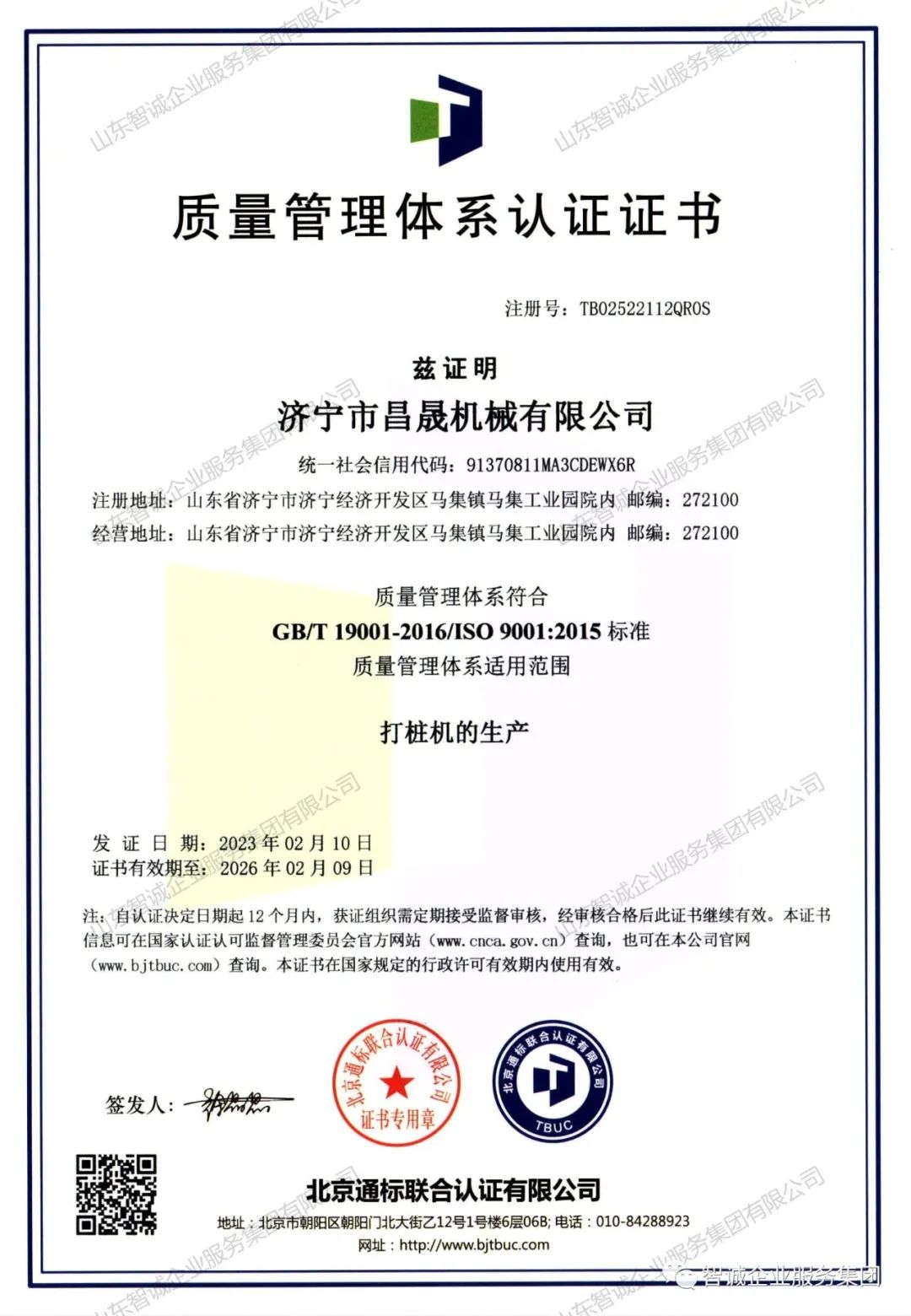 昌晟机械系列产品已顺利通过国家质检总局(打桩机械);昌晟机械产品由中国人民财产保险公司提供看起来保险。