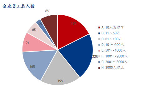 调研企业样本中,员工在100人及以下企业占比58.02%,100-1000人占比25.19%,1000人以上占比16.79%。