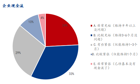 调研企业样本中,关于目前企业的现金流是否充裕,参与调研企业中表示非常充裕(维持半年以上没问题)占比24.17%,比较充裕(维持3-6个月没问题)占比33.08%,有些紧张(仅能维持1-3个月)占比28.75%,比较紧张(仅能维持1个月)占比10.43%,非常紧张(已经基本没有现金流了)占比3.56%。