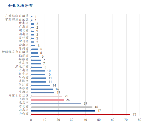 参与调研样本企业合计来自中国28个省份、自治区和直辖市。山西省、山东省、河北省位列前三,合计样本数165个,占比41.98%,其中山西省样本数73个,占比18.58%。