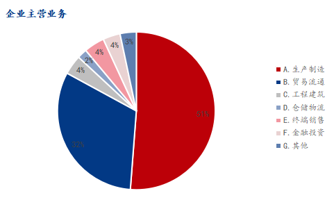 调研企业样本中,,主营业务为生产制造占比最大,其次为贸易流通,占比分别为48%和36%,合计占比84%。