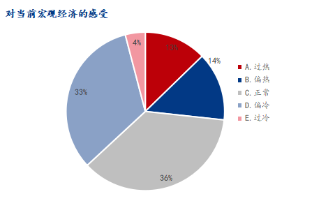 调研企业样本中,对当前宏观经济的感受,12.72%的企业表示过热,13.99%表示偏热,36.39表示%正常,32.82%表示偏冷,4.07%表示过冷。