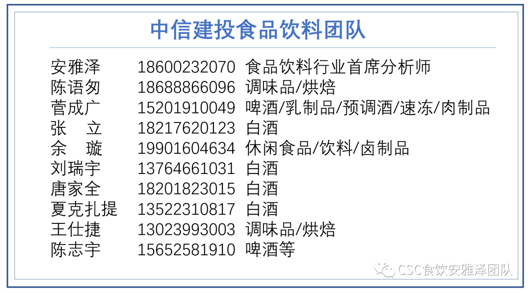 本公众订阅号(微信号:shipin_CYM)为中信建投证券有限公司(下称“中信建投”)研究发展部安雅泽S1440518060003食品饮料研究团队运营的唯一订阅号。