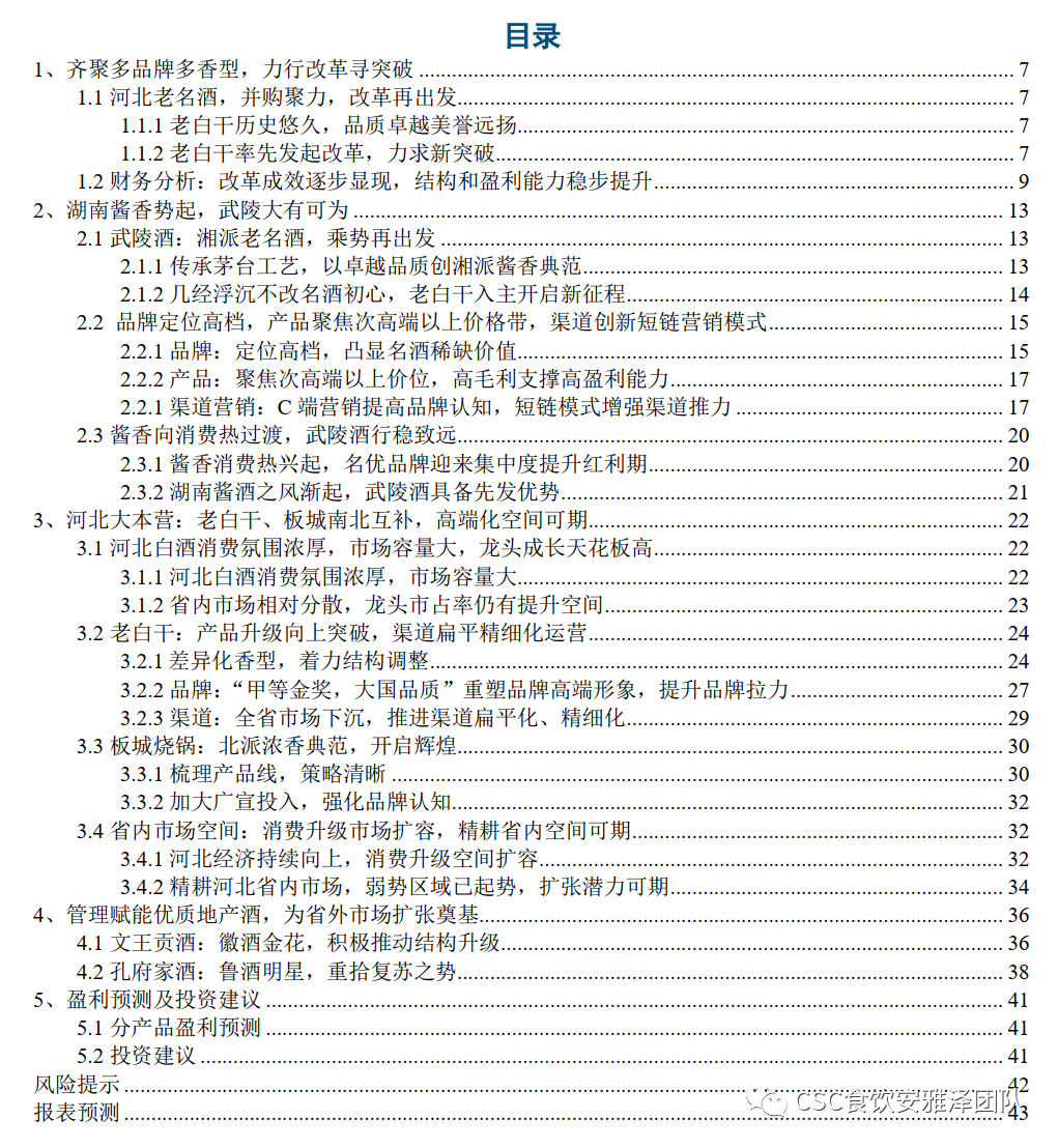 市场竞争加剧、消费升级节奏不及预期、渠道拓展不及预期等风险。目前河北市场仍旧是公司营收主要贡献部分,近年来公司在河北根据地市场持续推进结构升级,次高端以上价位产品在公司营收占比持续提升,但河北市场次高端及高端价位面临一些全国化的高端和次高端名酒竞争,因此省内市场竞争加剧或白酒消费需求下降可能给公司战略目标的实现带来压力。