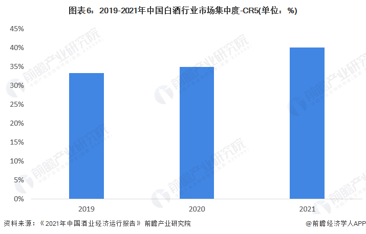 根据《2021年中国酒业经济运行报告》中的数据显示,2021年白酒头部企业表现较好。CR5销售收入占全行业年度销售收入比重达40%。这一指标在2019年为33.2%,2020年为34.9%。白酒市场销售在继续向头部企业集中。