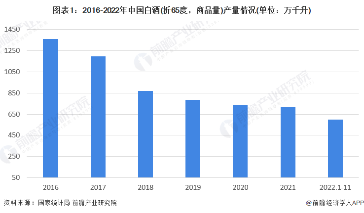 根据国家统计局数据,2016-2021年,中国白酒(折65度,商品量)产量呈现逐年下降的趋势。2021年,中国白酒(折65度,商品量)产量为715.6万千升,同比下降0.59%。2022年1-11月,中国白酒(折65度,商品量)产量为597.3万千升。