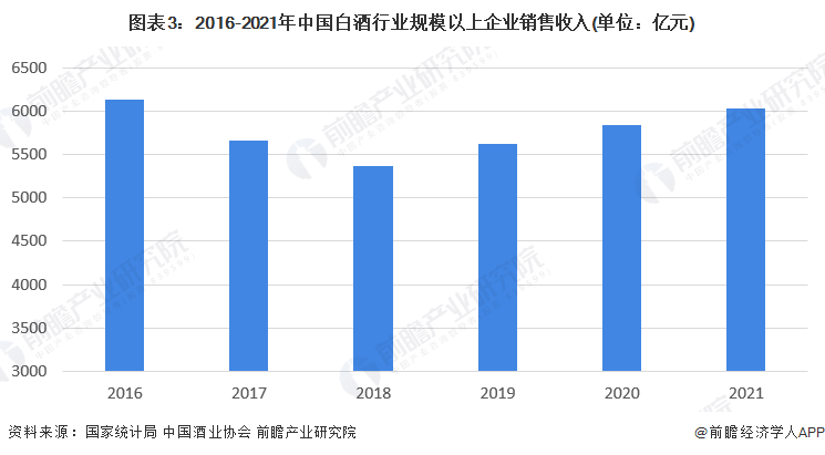 2016-2021年,我国白酒行业规模以上企业销售收入总体上呈先下降再上升的趋势。2019年,白酒行业加速推进供给侧结构性改革,随着去产能和调结构的逐步深化,行业总体呈现产出规模稳中有降、产出效益逐步提升的新特征,全国规模以上白酒企业实现销售收入5617.82亿元,同比增长4.74%。2020年中国规模以上白酒企业累计销售收入达到5836.39亿元,较2019年增长3.89%。2021年,根据中国酒业协会披露,2021年白酒行业规模以上企业销售收入为6033亿元。