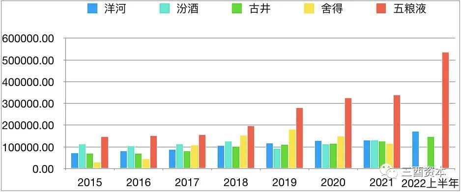 这5家白酒上市公司除舍得以外,白酒的营收规模早在2019年就均超过了百亿规模,行业的黄金发展周期让这些知名酒企不仅积累了丰厚的资金,还在扩产潮中增加了基酒储备量。白酒之所以十几年来被价值投资者奉为圭臬,就是其存货中基酒(财报中显示为:半成品)的价值会随着时间而不断增值,不会像其他行业的存货容易随时间而贬值,而当下中高端白酒竞争的核心就是基酒存量多少与年份长短。