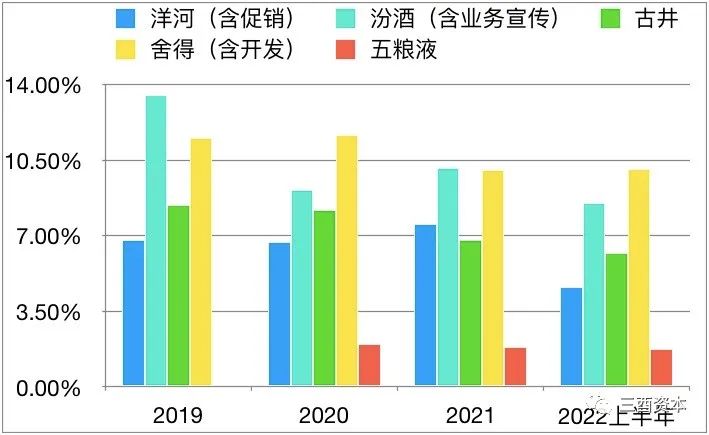 不仅古井,邻省地方名酒、浓香型白酒企业洋河股份广告费用率(含促销费)长期徘徊在6%至7%左右的区间,而浓香老大五粮液广告费用率自2020年至今还未超过2%,可见酒企每年投入的广告费对于其营收或销售费用的总盘子来看不足为奇。