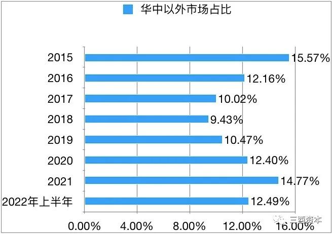 2015年,古井年份原浆商标注册成功,浓香型白酒继国窖、蓝色绵柔之后又一个全新概念出现,这一年古井年份原浆还未走上央视春晚舞台,华中以外市场占营业收入比例为15.57%,次年登上春晚舞台后,古井在华中以外市场的占比再没有超过15%。