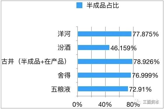 据2021年财报显示,这5家酒企中,半成品占存货比例最小的是汾酒,但也达到了46.16%,接近50%;古井贡酒为78.93%,为5家最高,但其中含有在产品(这项不属于基酒),其他三家半成品占存货比例均超过了70%。