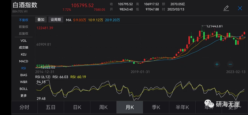 这是白酒行业近10年的走势图,从2014年的12000点到今天的12万1千点附近,涨幅达到了惊人的十倍,所以白酒行业的长期投资价值是非常高的。
