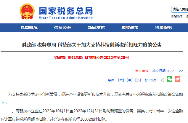 高新技术企业在2022年10月1日至2022年12月31日期间新购置的设备、器具,允许当年一次性全额在计算应纳税所得额时扣除,并允许在税前实行100%加计扣除。