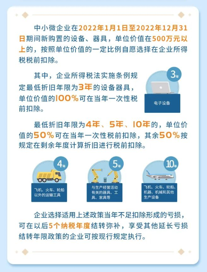 中小微企业在2022年1月1日至2022年12月31日期间新购置的设备、器具,单位价值在500万元以上的,按照单位价值的一定比例自愿选择在企业所得税税前扣除。