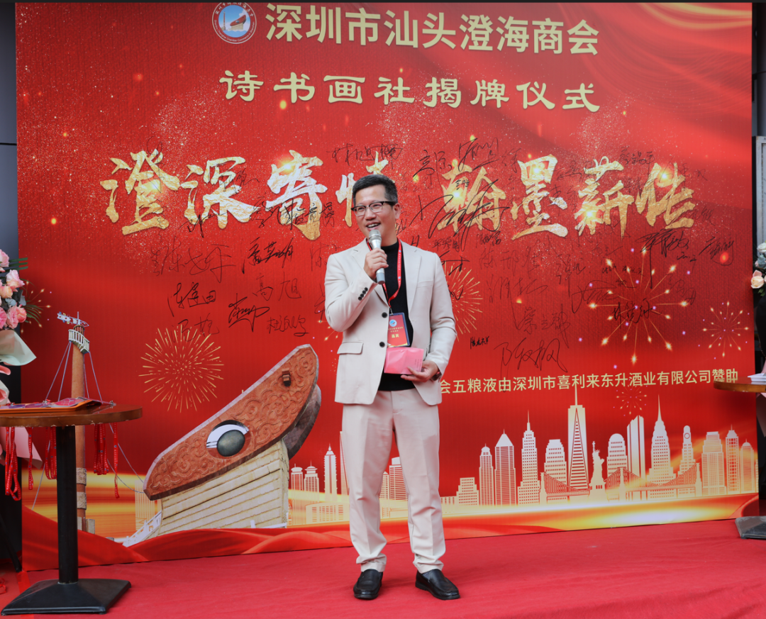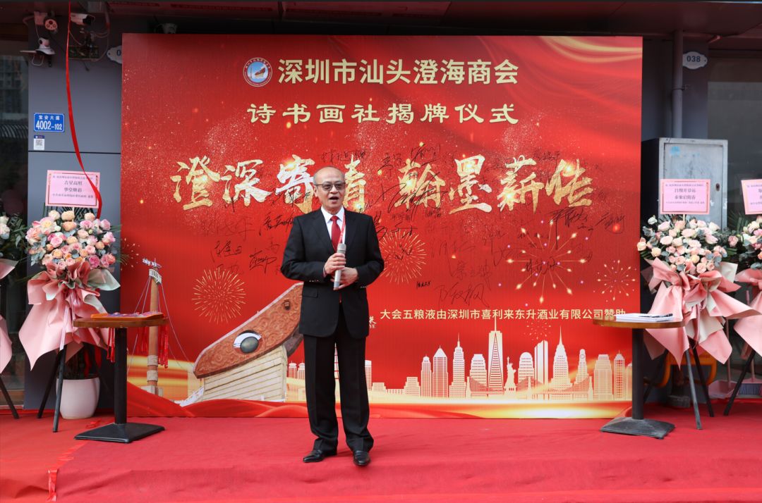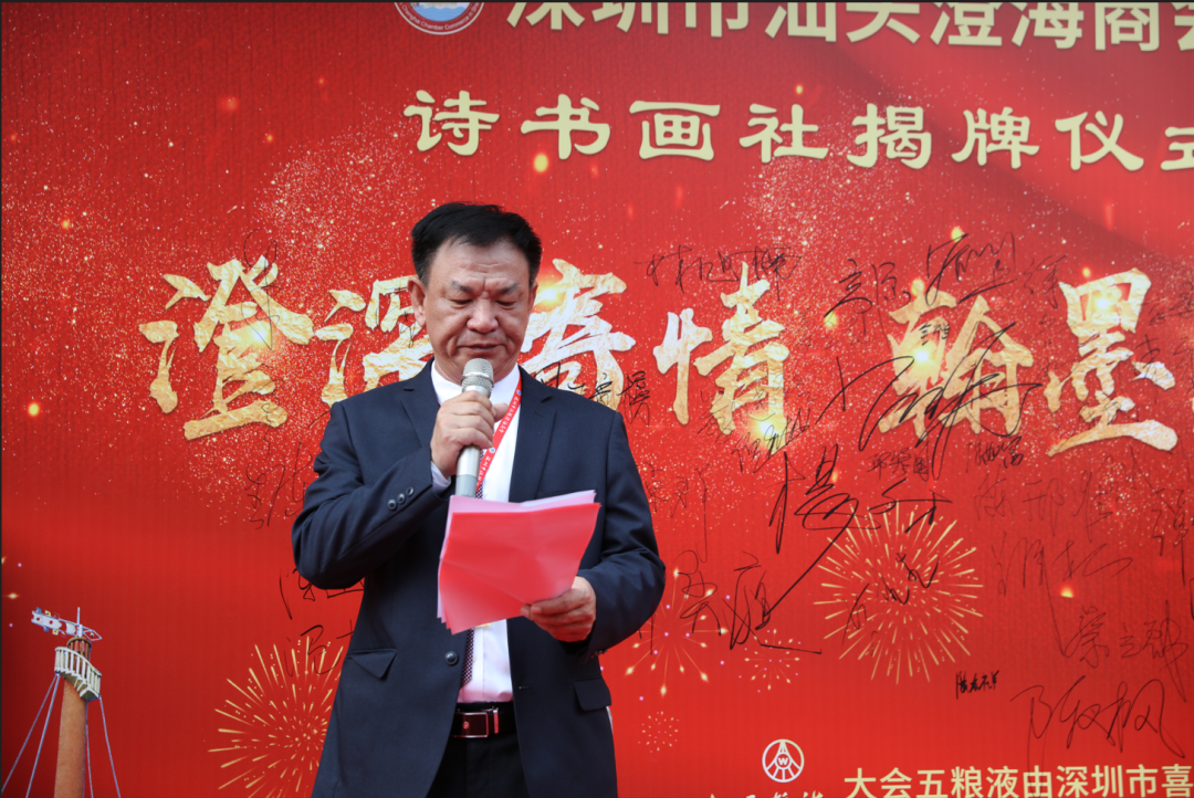 肖泽涛会长介绍,深圳市汕头澄海商会诗书画社就是深圳市汕头澄海商会的下属机构,由商会名誉会长余寒生老师在2021年12月19日第七届第一次会长会议上倡议成立的,经过商会同仁和文化界老师们的共同努力终于完成筹备工作,一年多来,大家出钱出力,出谋献策,全部资金投入均是大家捐赠,没有花费商会会费。特别鸣谢余寒生执行社长,没有您的提议指点就没有今天的诗书画社、特别鸣谢今天的主持人罗育毅社长,有您一年多来一直的鼓励、陪伴和建议,诗书画社才有今天的盛况。诗书画社社址由第七届会长捐用十年,作为商会下属机构,今后将在合法合规的情况下,服务会员乡亲,逐步完善项目,尽量做到自给自足,不向商会报销费用。诗书画社将按以文会友形式,与其他社团进行文化交流,弘扬潮汕文化,宣传澄海特色,力争成为家乡澄海在深圳的一张名片。