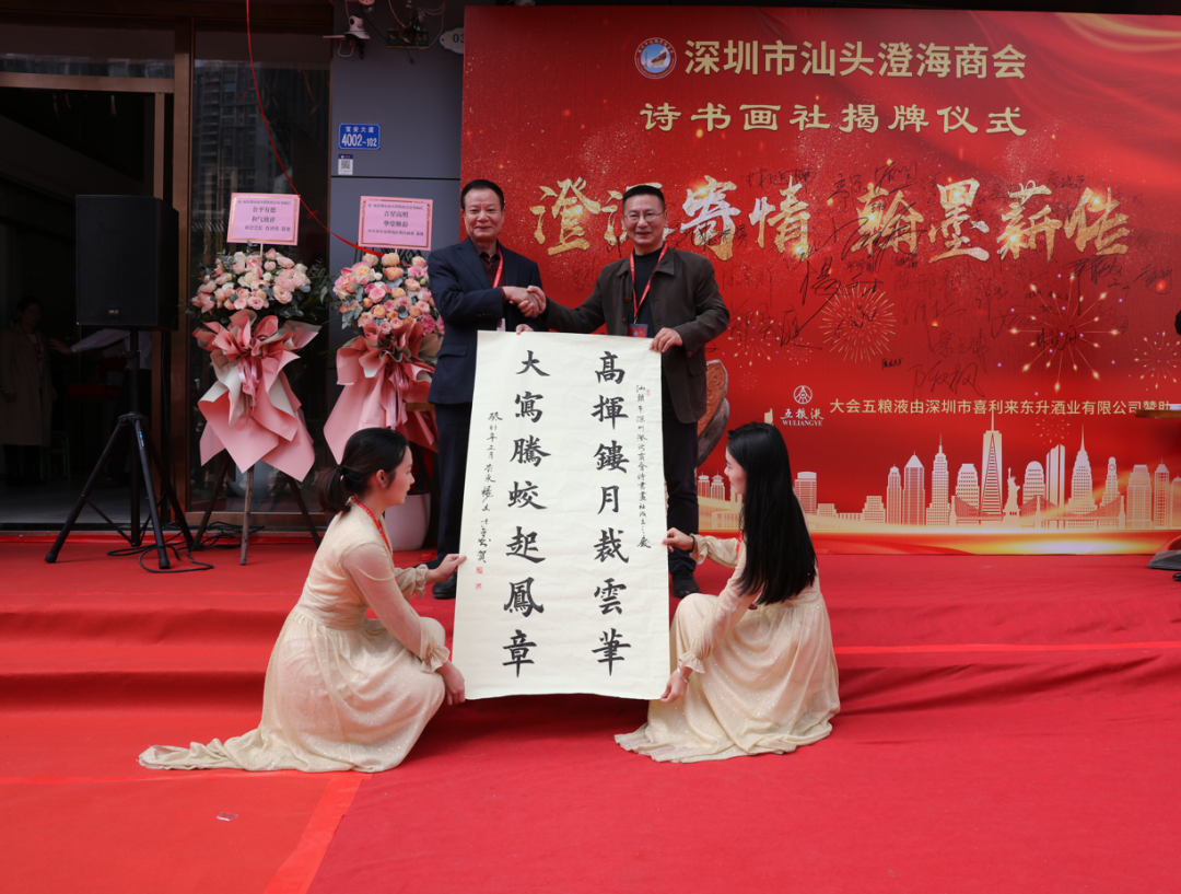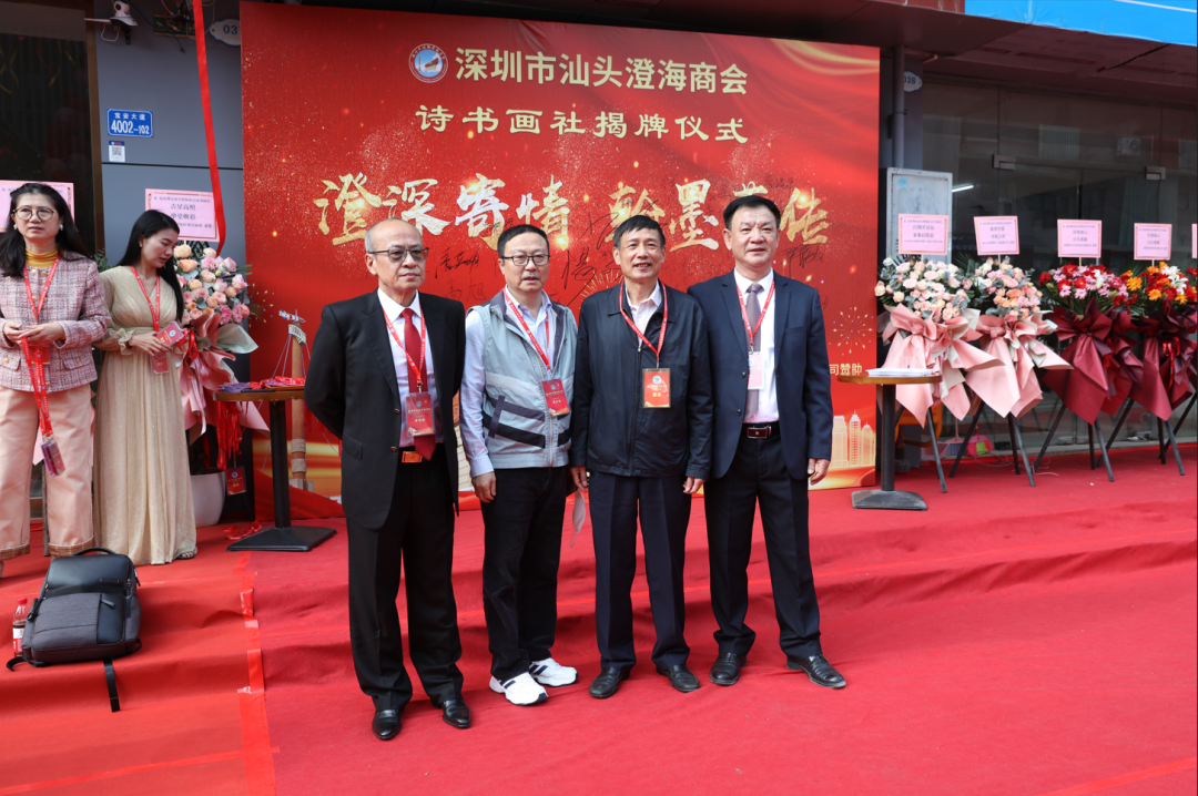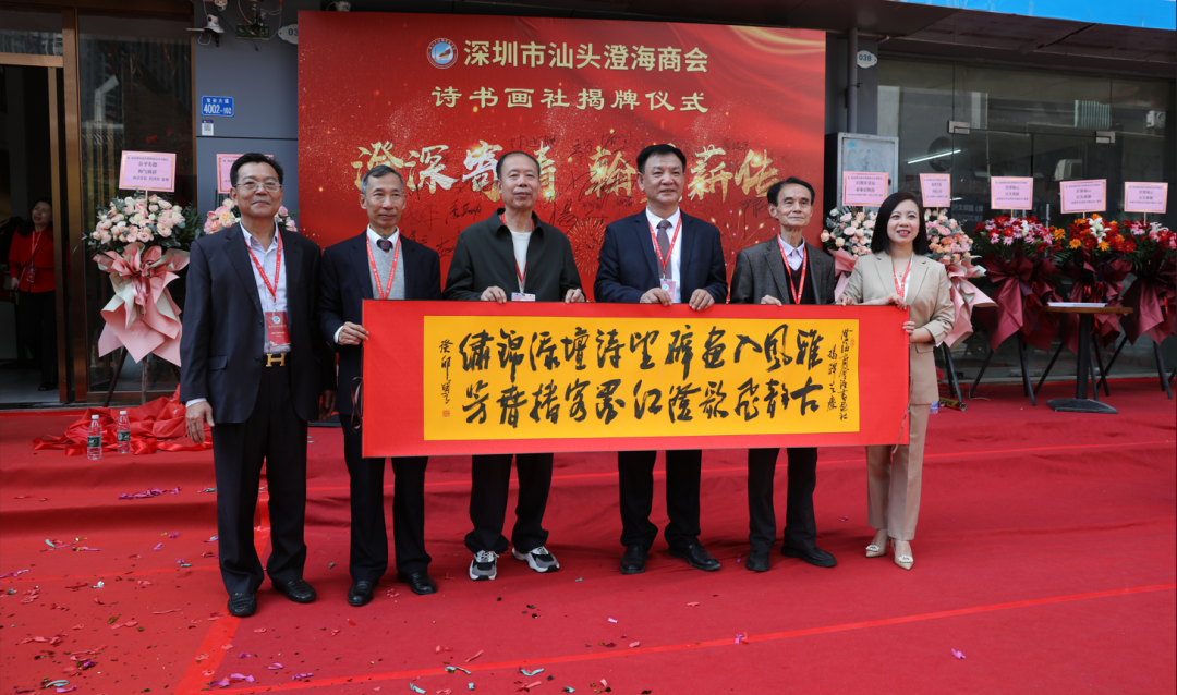 2023年2月12日上午十点,晴空万里,伴随着新春的吉祥气氛,深圳市汕头澄海商会诗书画社在宝安碧海名园正式成立。出席今天揭牌仪式的领导、嘉宾、社团代表有:澄海区委常委、统战部部长郑奕庭;工商联党组书记林镜泳;新阶联会长陈烽;全球汉诗总会副会长兼秘书长陈小明;深圳市诗词学会会长杨文才;深圳市长青诗社社长高源,党支部书记、执行社长周兴海,常务副社长、长青书画院院长彭定军,副社长赵秀敏、姜晓玮、刘万专; 深圳市儒家文化研究会会长徐晋如、秘书长谢军、诗教部部长张刃; 深圳市宝安区诗词学会会长池雪平、副秘书长陈昭维; 深圳市打铁文艺社联合创始人李劲; 深圳市潮汕文化研究会会长黄惠生、常务副会长倪壁雄; 深圳市澄海中学校友会、苏北中学深港校友会、侨中校友会代表等。我会永远荣誉会长许少汕、荣誉会长罗育毅、杜斌;名誉会长余寒生、陈世平、陈邢准、蔡国良、陈锐敏;会长肖泽涛,监事长王楚群,秘书长陈卓群;商会1~2月份值班会长:陈琪、曾广歆、蔡泽松、蔡镇群、李建丹;常务副会长陈义枫、杜实东、肖翰;副会长王卓成、黄瑶雄、副会长兼党支部书记蔡淳林;监事王斌;商会法律服务社社长陈卫滨;名誉顾问陈建华、林旭楠;理事赖钊凯、王少宏、王卫川、肖锐、杜汶鸿;常务副秘书长陈媛、陈来仪、陈璧如、林胜贤及会员、青创社义工等100多人参加此次活动。