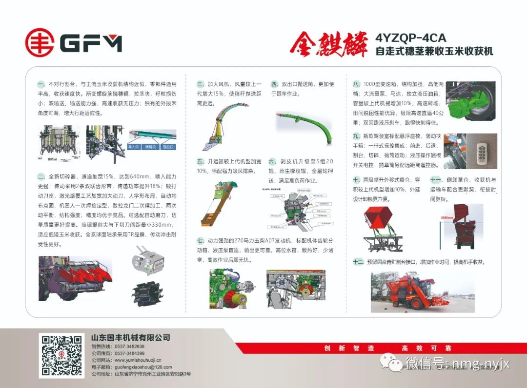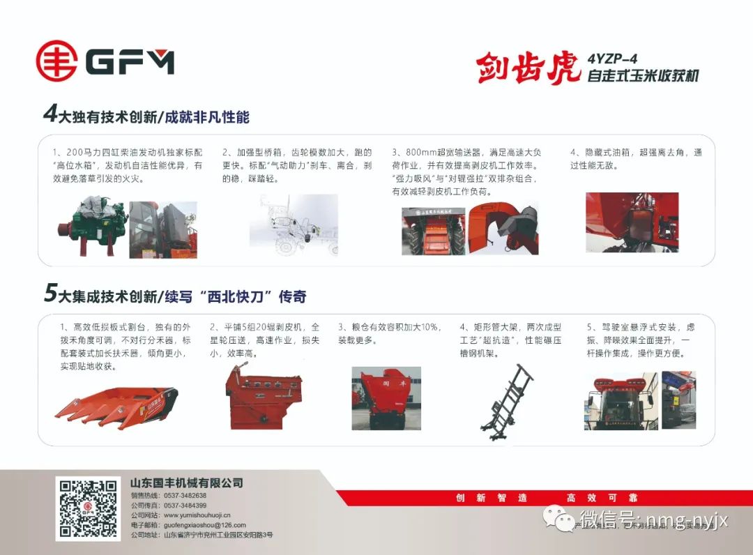 山东国丰机械有限公司是一家专业从事玉米收获机研发制造的现代化农机企业,占地315亩。1995年研发成功我国第一台背负式玉米收获机,至今28年来始终专注于玉米收获机械的研发与制造;核心产品“自走式玉米收获机”,目前已形成果穗收获、籽粒收获、穗茎兼收和鲜食玉米采收等4大系列20多个规格型号。其中“高效率”玉米收获机“三分钟一亩地”骄人战绩多次刷新,作业速度行业“领跑”;“高性能”穗茎兼收机“日收益过万元”备受瞩目,凭借收获效率高,作业质量好,深受用户和养殖户好评,产销规模名列前茅。