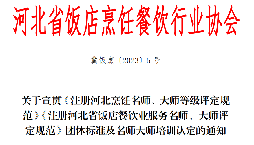 为促进河北餐饮文化和烹饪技艺的传承与发展,进一步规范烹饪(餐饮服务)大师、名师等级评定规范,不断培养和造就新的行业领军人才,河北省饭店烹饪餐饮行业协会计划于2023年3月上旬在保定市举办《注册河北烹饪名师、大师等级评定规范》《注册河北省饭店餐饮业服务名师、大师评定规范》团体标准宣贯暨名师大师培训认定考核工作。并重新启动原定于2022年10月27日在保定虎振学校举办的2022年河北省行业职业技能竞赛第九届全国饭店业职业技能竞赛河北省选拔赛。现将以上两个活动的通知发给大家,望仔细阅读通知,并积极参加活动,期待承德选手取得好成绩。