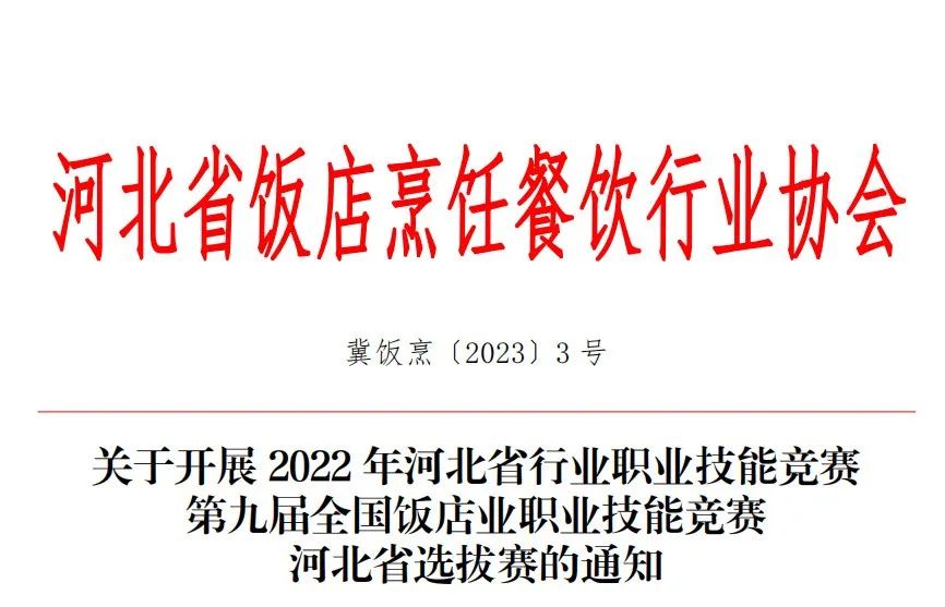 原定于2022年10月27日在保定虎振学校举办的2022年河北省行业职业技能竞赛第九届全国饭店业职业技能竞赛河北省选拔赛计划于2023年3月在保定重新启动,根据省人社厅《关于组织开展2022年河北省行业职业技能竞赛的通知》(冀人社字〔2022〕190号)和省职业技能鉴定中心《关于组织开展2022年河北省行业职业技能竞赛(二类竞赛)的通知》(冀职鉴字〔2022〕14号)要求,现将有关工作通知如下:一、时间地点