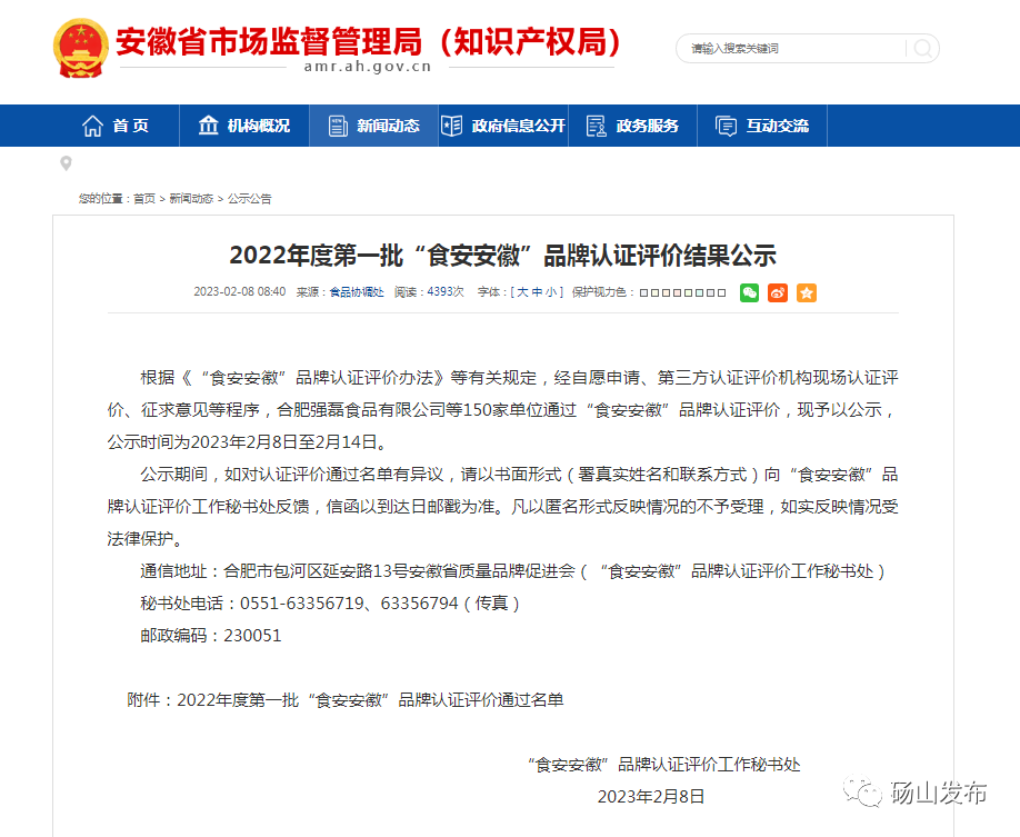 公布2022年度第一批“食安安徽”品牌认证评价拟通过名单