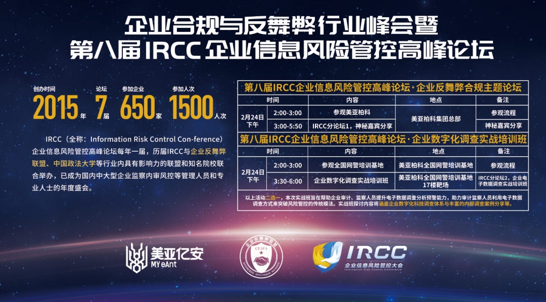 由企业内部控制协会主办、企业反舞弊联盟工作委员会承办、厦门美亚亿安信息科技有限公司协办的“企业合规与反舞弊行业峰会暨第八届IRCC企业信息风险管控高峰论坛”,将于2023年2月23日-2月24日在福建厦门召开。