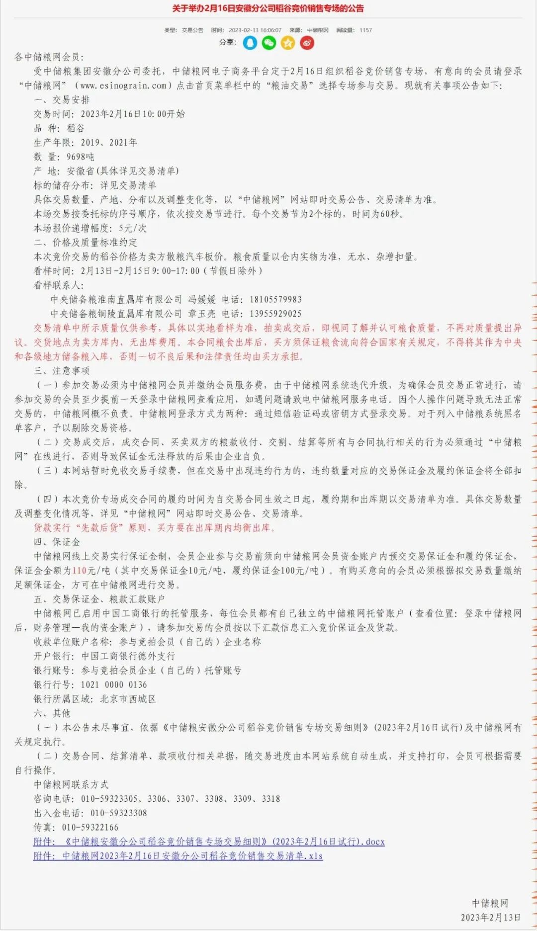 关于举办2月16日安徽分公司稻谷竞价销售专场的公告