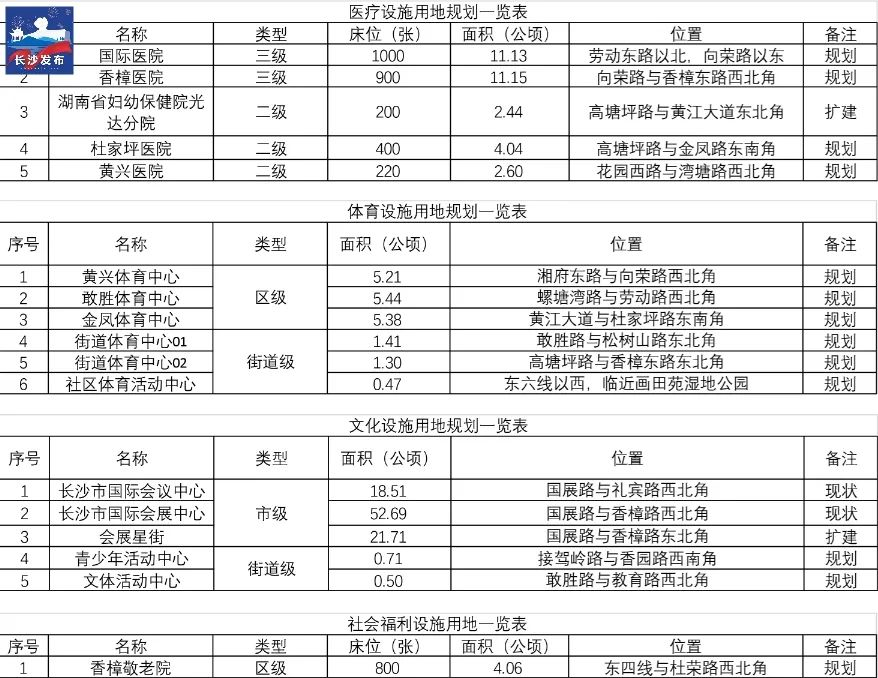 康体资源也是一个重点。体育健身方面,规划了区级体育设施3处,街道级体育设施3处。社会福利方面规划了香樟敬老院,让市民“老有所养,病有所医”。医疗教育方面,规划了黄兴医院等2处二级综合医院,1处二级专科医院,国际医院等2处三级综合医院。