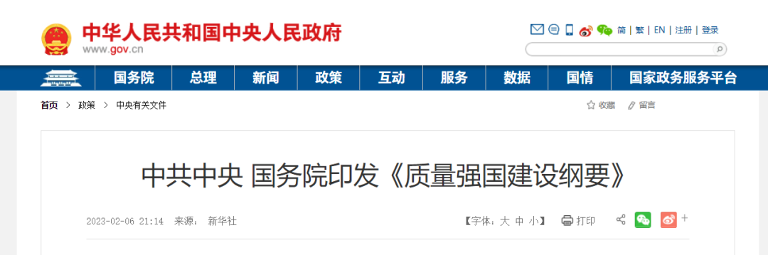 2月6日,中共中央、国务院印发《质量强国建设纲要》。其中提到,树立质量发展绿色导向,开展重点行业和重点产品资源效率对标提升行动,加快低碳零碳负碳关键核心技术攻关,推动高耗能行业低碳转型。全面推行绿色设计、绿色制造、绿色建造,健全统一的绿色产品标准、认证、标识体系,大力发展绿色供应链。优化资源循环利用技术标准,实现资源绿色、高效再利用。建立健全碳达峰、碳中和标准计量体系,推动建立国际互认的碳计量基标准、碳监测及效果评估机制。建立实施国土空间生态修复标准体系。建立绿色产品消费促进制度,推广绿色生活方式。