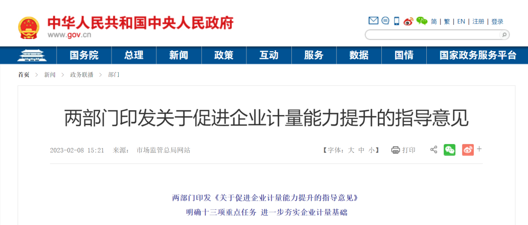 2月8日,国家市场监管总局、工信部联合发布《关于促进企业计量能力提升的指导意见》。《意见》指出,鼓励企业加强能源资源计量和低碳计量。强化用能用水单位的能源、水资源计量器具配备和管理要求,加强重点用能单位能耗在线监测平台建设,组织开展用能单位能源计量审查,持续开展能源资源计量服务示范活动。推动企业建立健全碳计量体系,研究建立重点排放单位碳计量审查制度。支持企业参与低碳、节能、节水、环保、清洁生产、资源综合利用等领域共性计量技术研发。