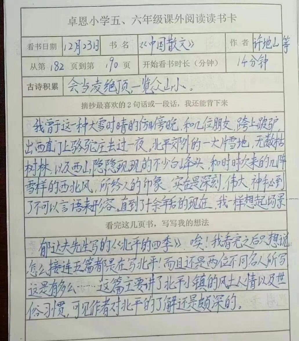 一个爱读书的人,其视野必然开阔,其志向必然高远,其追求必然执着!养成良好的阅读习惯,其意义深远也!根据寒假前的作业布置,孩子们积极投入到了阅读的氛围中,尽情地享受阅读带给他们的心旷神怡,尽情地体会阅读带给他们的妙趣横生。