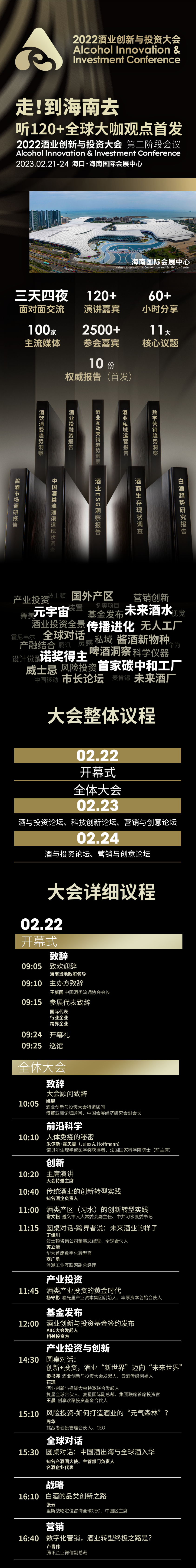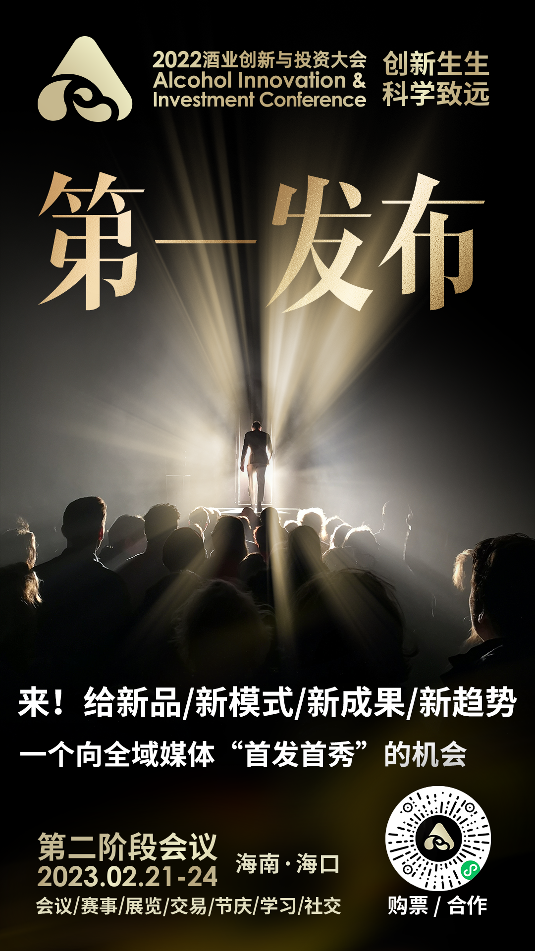 2月21日-24日,2022酒业创新与投资大会第二阶段大会在海南举行。大会将设置“第一发布”平台,现场发布品牌美誉度高、革命性创新、业内主流认可、具备未来感的产品/模式/成果/趋势,并向100+媒体进行推广,为每一品牌提供高端、主流、全域传播。