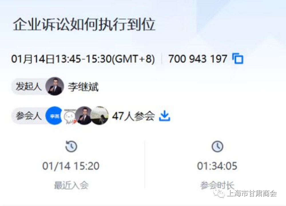 新年刚过,1月14日,由上海市甘肃商会主办,上海市甘肃商会·双创会承办,商会理事单位、上海盈钲法保企业管理服务有限公司共同协办的——“企业诉讼后如何执行到位(暨上海陇商定制法律专题讲座第五期)”专题法律讲座圆满结束,此次讲座通过腾讯会议形式在线上直播,商会会长鸭王集团有限公司董事长范臻,商会理事、北京市京师(上海)律师事务所律师朱爱军、上海盈钲法保企业管理服务有限公司总经理李继斌、上海哲睦实业有限公司总经理杨盘军、上海波实网络科技有限公司总经理韩宝泉,商会会员、上海澜亭信息科技有限公司王波龙、上海霞享企业管理咨询有限公司总经理鲁霞等会员及其他社会人士共计47人参加。