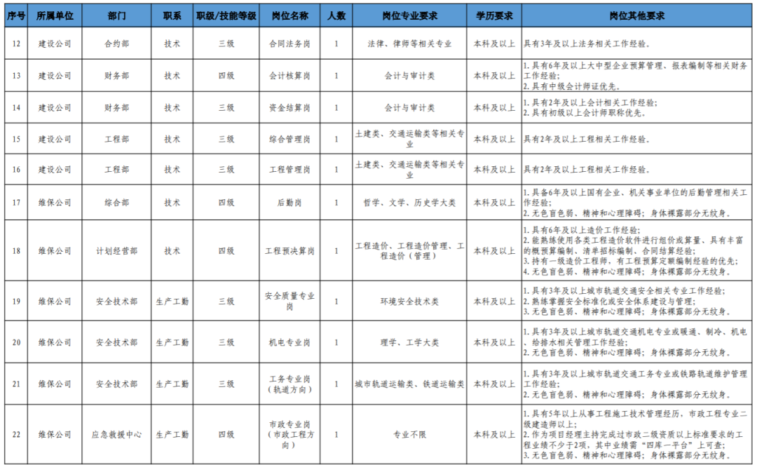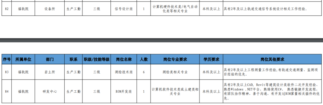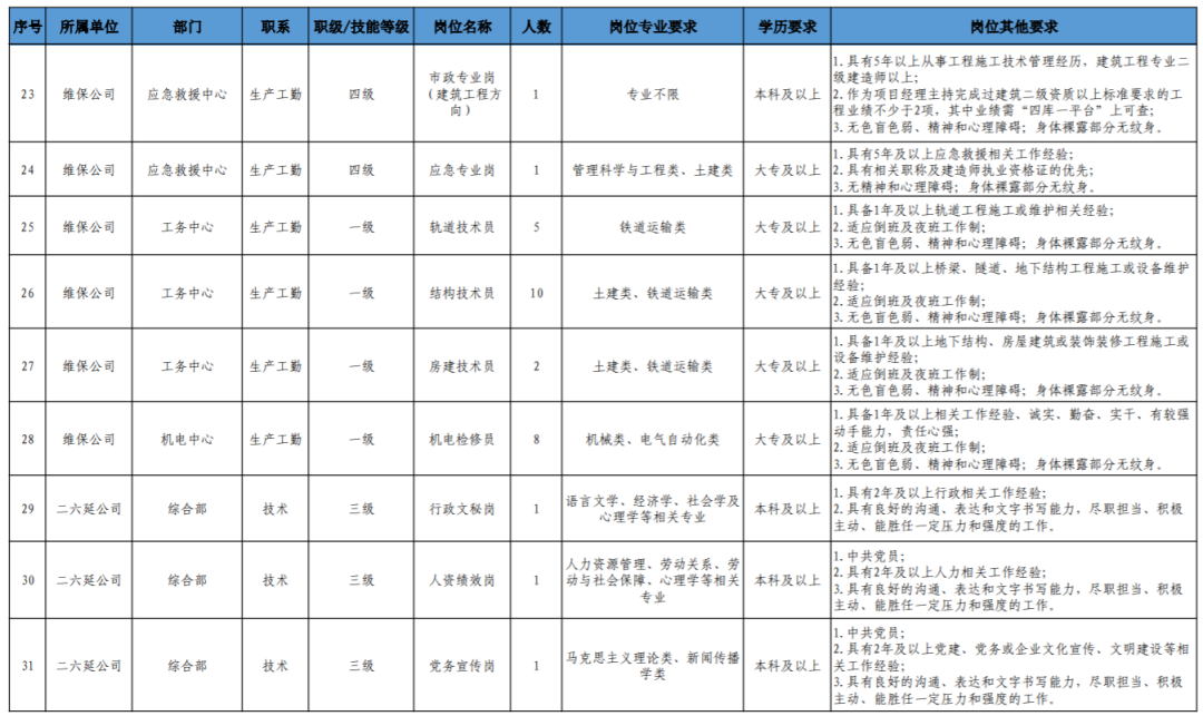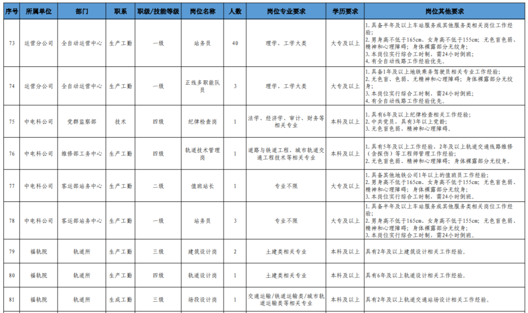 岗位代码、用人单位、岗位名称、学历、专业、工作年限、岗位说明及要求等信息详见附件《福州地铁2023年社会招聘工作人员岗位需求表》