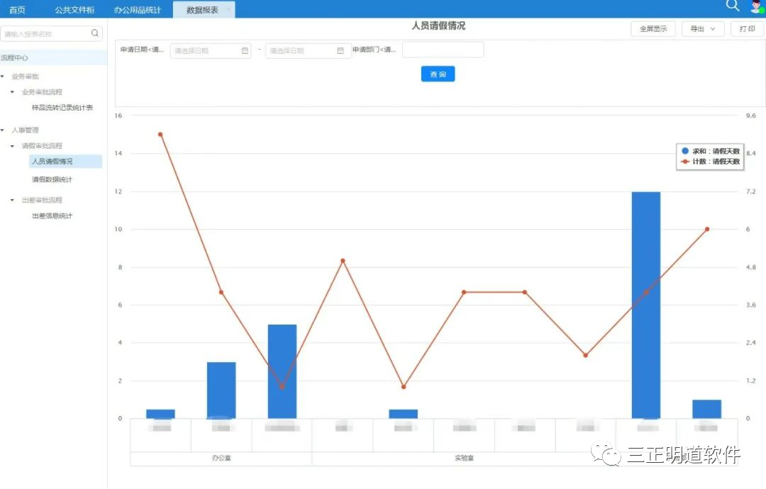 4、报表分析,利用流程中心-数据报表实现数据报表展示。