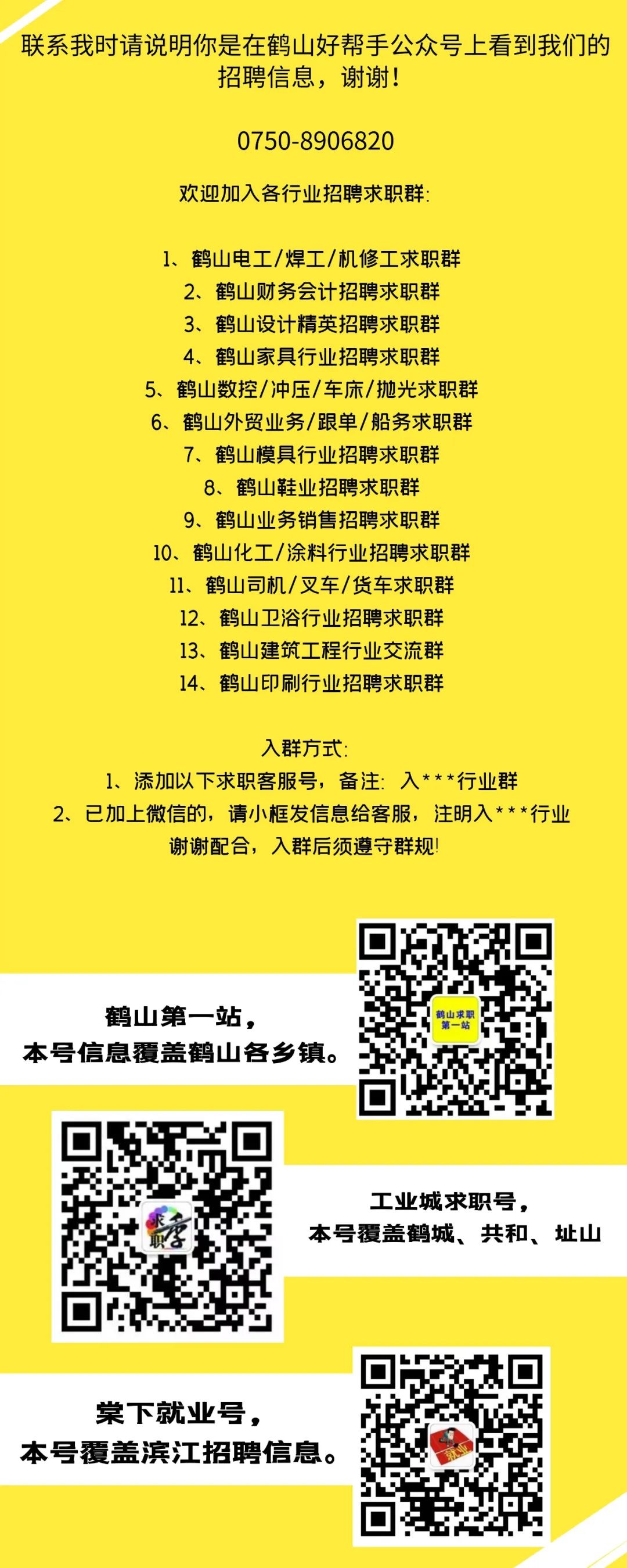 要求:责任心强,思维清晰,认真细致,有工厂的工作经验,能适应工厂车间的工作。