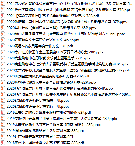 关键词推介:活动策划方案、嘉年华活动策划、展陈策划设计、主题展活动方案、展位规划设计、主题展美陈方案、商业展陈方案、展会方案、会展策划方案、品牌展馆调研、展厅开放活动、展厅设计活动、年度合作方案、定展执行手册、营销合作方案……