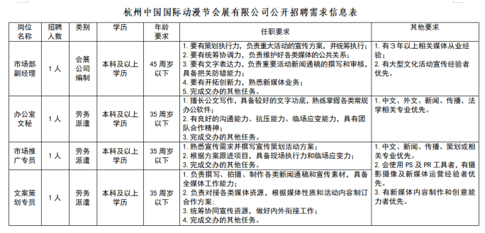 杭州中国国际动漫节会展有限公司系杭州市动漫游戏产业发展中心直属的国有全资公司,成立于2006年5月,负责中国国际动漫节的策划执行,以及杭州动漫游戏产业和相关会展工作。因公司发展需要,现面向社会进行公开招聘。现将有关事项公告如下: